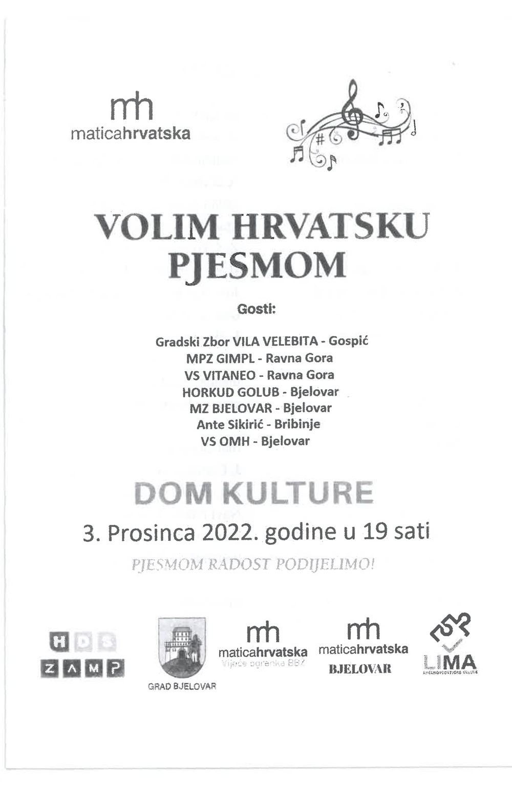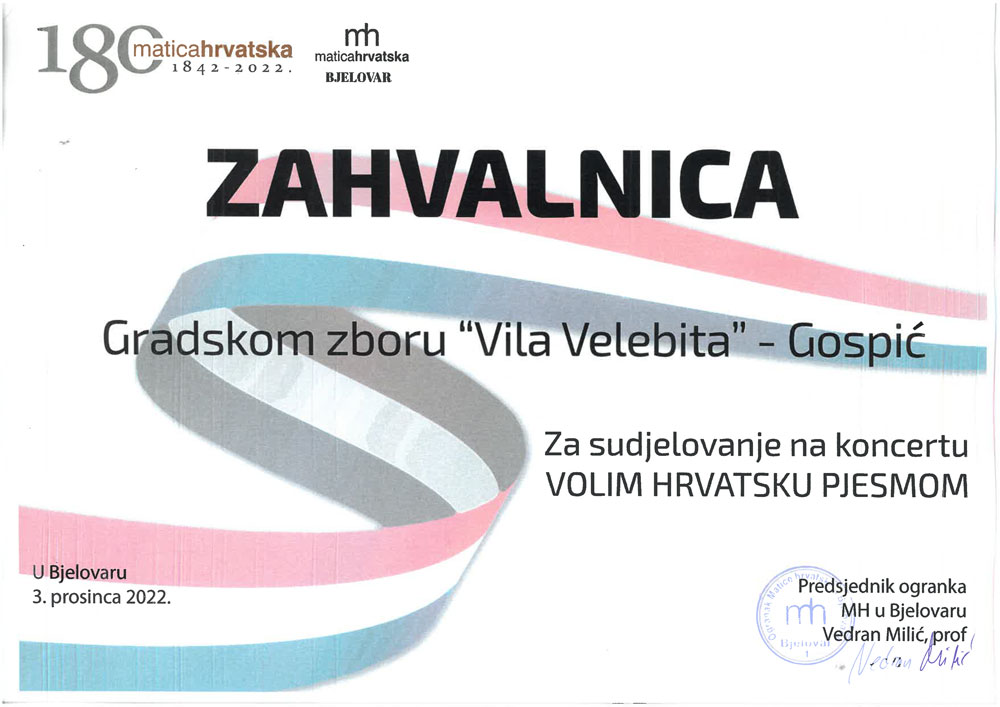 Prigodom 180 godina od osnutka najstarije hrvatske kulturne institucije Matice hrvatske, Matica hrvatske Ogranak Bjelovar upriličila je koncert za pamćenje po nazivom „Volim Hrvatsku pjesmom“ u poprilično popunjenoj dvorani obnovljenog Doma kulture u Bjelovaru. Na programu su bile: domoljubne, tradicionalne, duhovne, adventske i božićne pjesme.