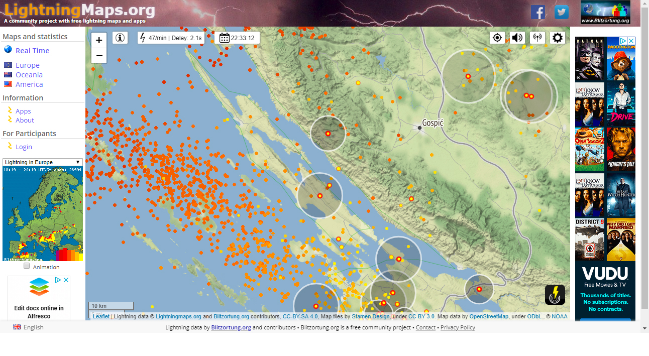 Na stranici lightningmaps.org vidljivo je da je grmljavinsko nevrijeme zahvatilo i Gospić.