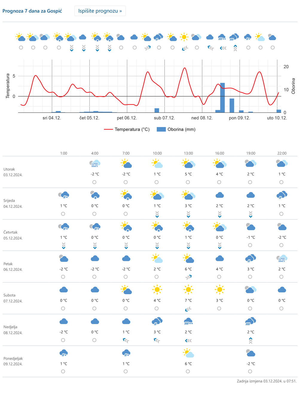 Pretežno oblačno uz mjestimičnu oborinu, češću na Jadranu. U Dalmaciji su ponegdje mogući obilniji pljuskovi, lokalno i grmljavina, a ponajprije u Gorskoj Hrvatskoj past će i malo susnježice ili snijega. Lokalno je u unutrašnjosti moguća magla. Vjetar slab do umjeren sjeveroistočni. Na Jadranu će puhati umjerena i jaka bura, uglavnom podno Velebita s olujnim udarima, a na krajnjem jugu zemlje jugo. Temperatura zraka u unutrašnjosti uglavnom bez izraženog dnevnog hoda i bit će od 2 do 6 °C. Na Jadranu najniža temperatura između 7 i 10, a najviša većinom od 10 do 15 °C.