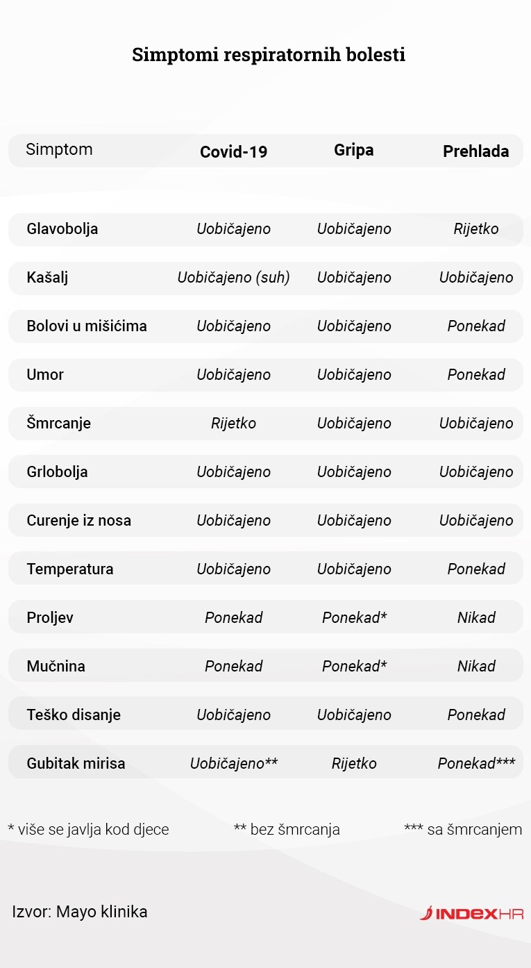 “Kašalj i curenje nosa mogu se pojaviti u svim trima bolestima. Gubitak mirisa svojstven je samo covidu. Otežano disanje javlja se samo u najtežim slučajevima gripe i covida, najčešće kod pojave upale pluća”, tumače stručnjaci iz Frana Mihaljevića.