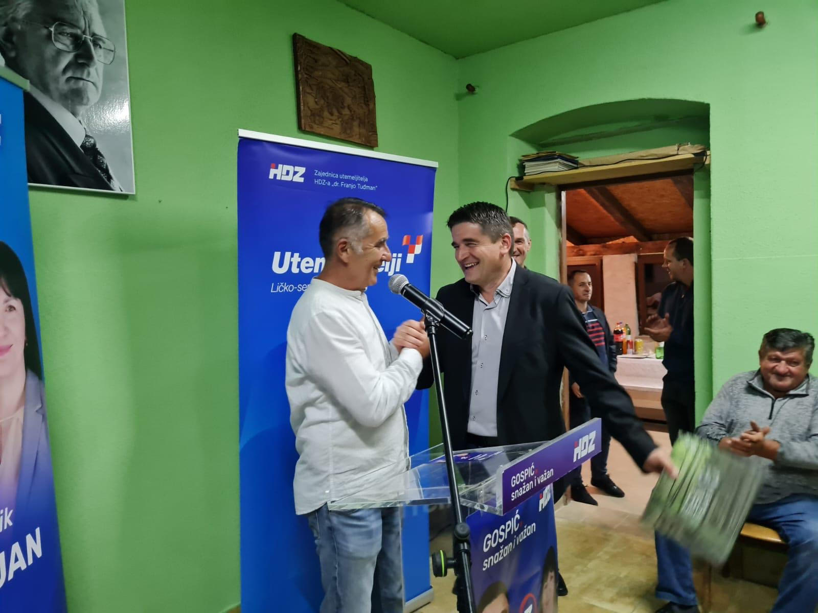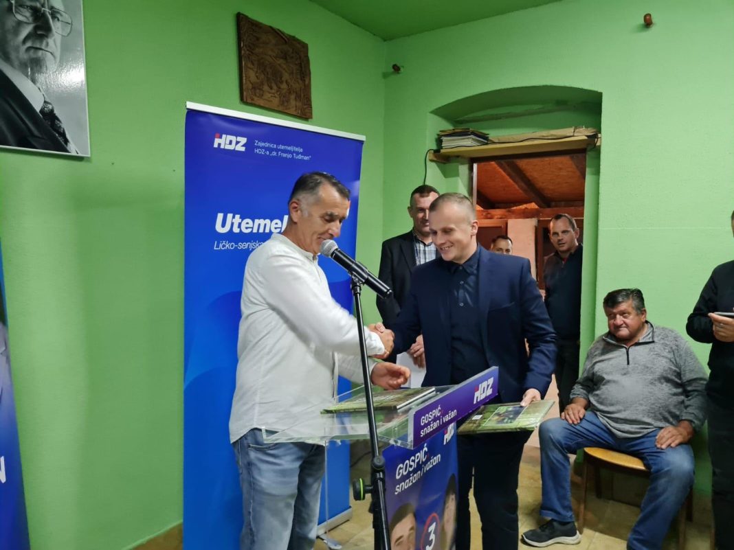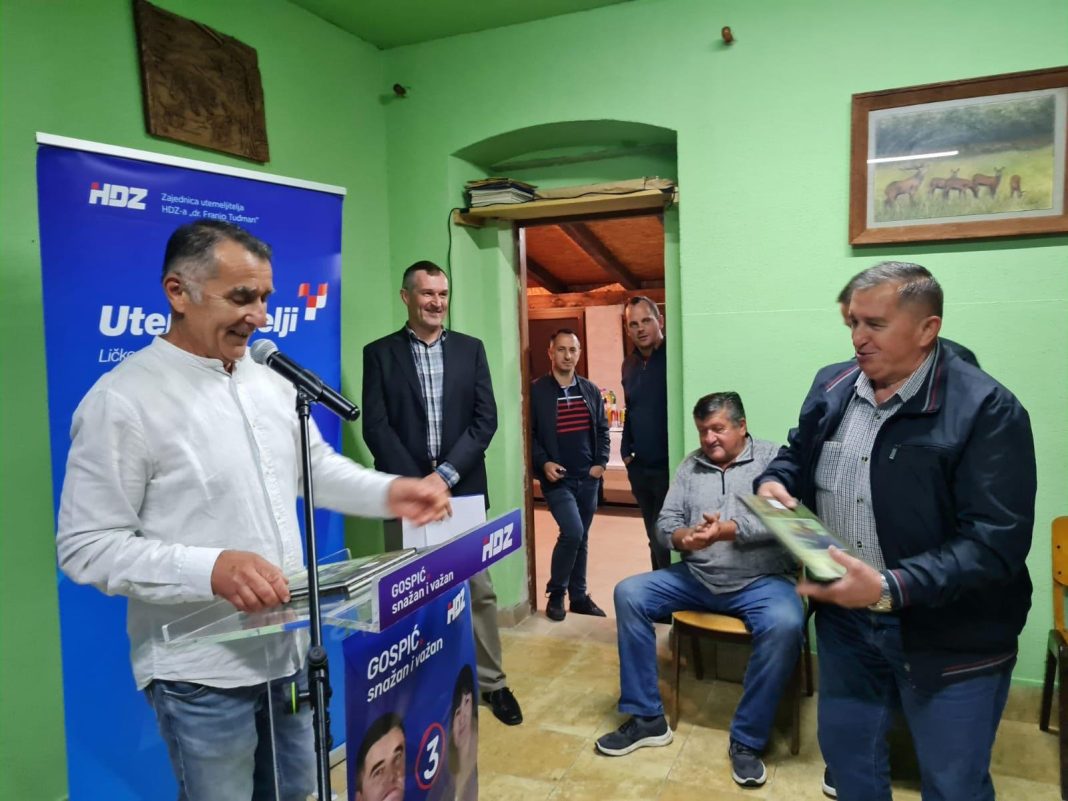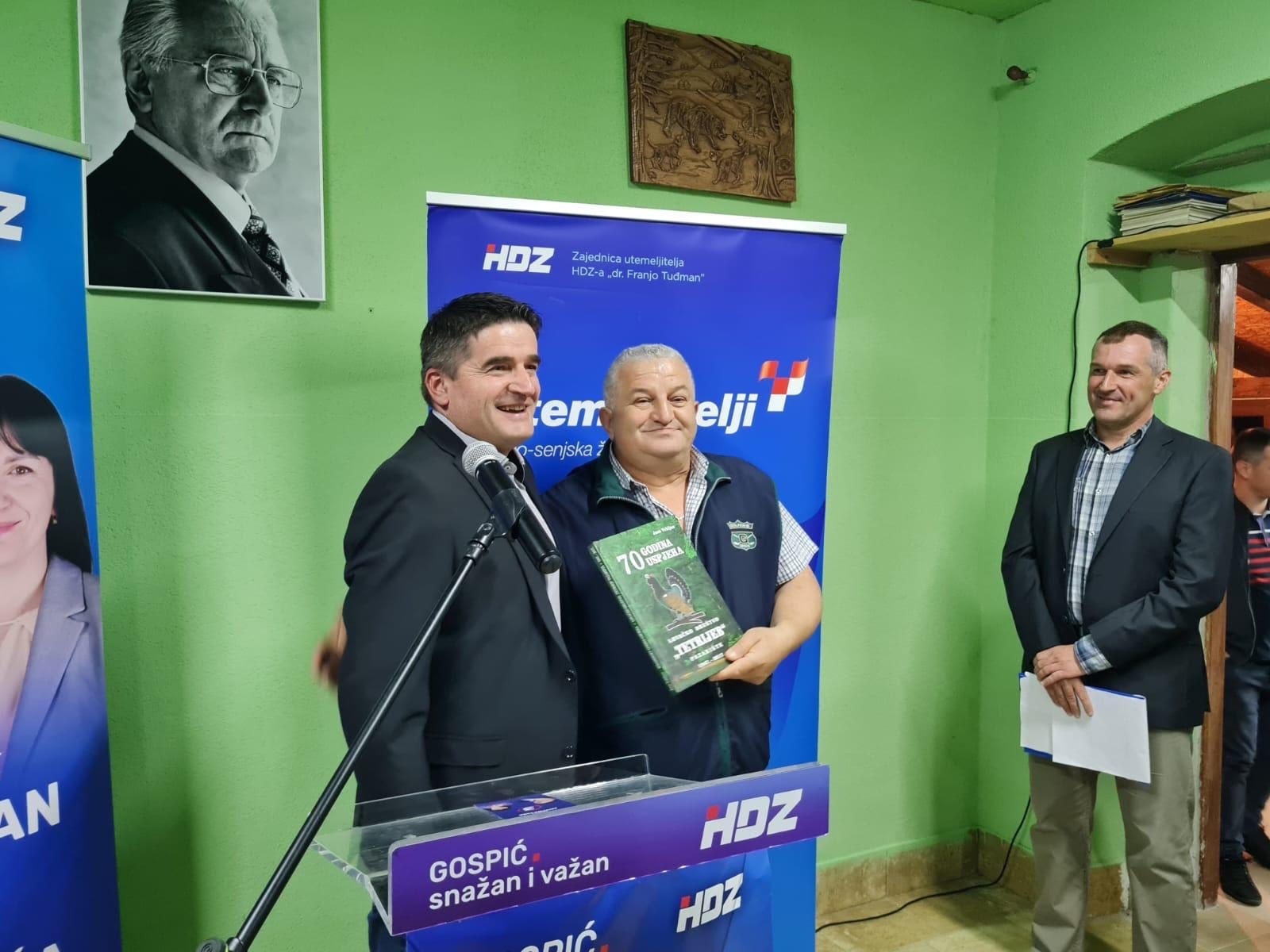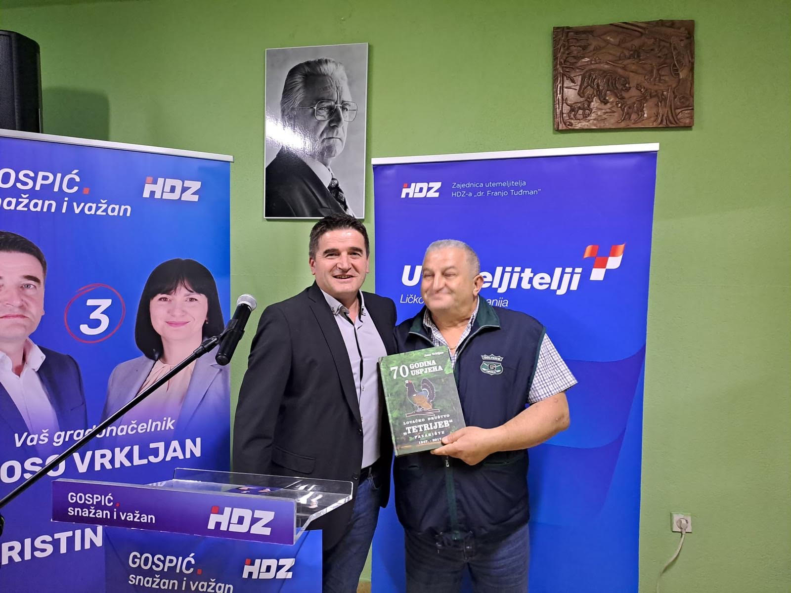 Po završetku obraćanja, Vrkljan je iskoristio prigodu da daruje svoju monografiju pod nazivom „70 godina uspjeha lovačkog društva „Tetrijeb“ Pazarište“ Tomici Krmpotiću-Ašanu, nakon čega je predsjednik TO HDZ-a Smiljan Josip Čorak darovao kandidata za gradonačelnika Vrkljana i njegovu zamjenicu Pršu, predsjednika Zajednice branitelja HDZ-a „Gojko Šušak“ Ličko-senjske županije Paju Brkljačića i predsjednika Mladeži HDZ-a Ličko-senjske županije Marina Marasa, monografijom „Lovačko društvo Lika Gospić“.