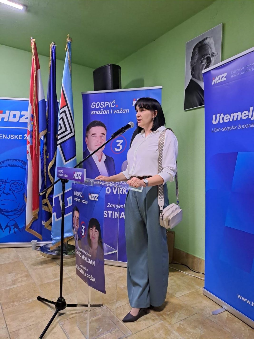 Kandidatkinja za zamjenicu gradonačelnika Kristina Prša u svom govoru naglasila je kako se s ponosom priključila timu HDZ-a iz razloga jer je HDZ jedina kvalitetna i pobjednička opcija uz koju Grad Gospić kroz narednih 10 mjeseci može napredovati i realizirati sve započete i nedovršene projekte, kao i pokrenuti nove koji su Gospiću prijeko potrebni.