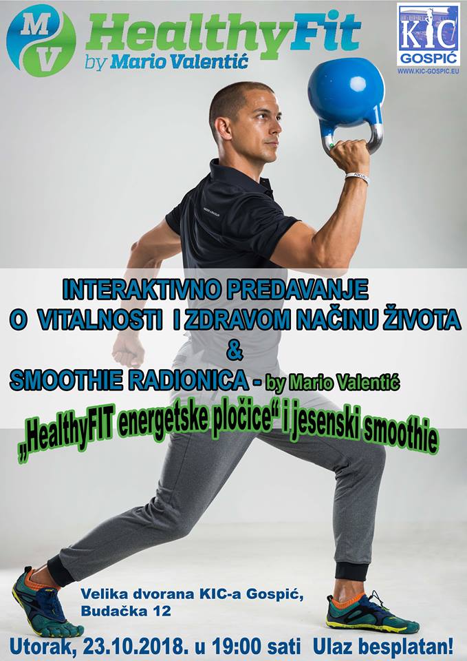 U utorak, 23. listopada 2018. godine s početkom u 19 sati u velikoj dvorani KIC-a Gospić, interaktivno predavanje o vitalnosti i zdravom načinu života održat će Mario Valentić, profesor kineziologije i osobni kondicijski trener. Predavanje uključuje i smoothie radionicu tijekom koje će Mario pripremiti jedan jesenski smoothie  i „HealthyFIT energetske pločice“. Posjetitelji će pripremljeno moći degustirati i naravno dobit će recept!