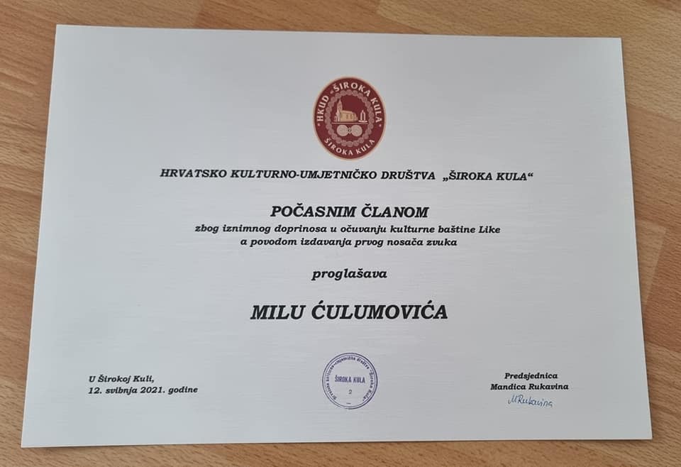 Zbog iznimnog doprinosa u očuvanju kulturne baštine Like, povodom izdavanja prvog nosača zvuka POČASNIM ČLANOVIMA Hrvatskog kulturno-umjetničkog društva „Široka Kula“ proglašavaju se MILE ĆULUMOVIĆ I BLAŽ ŽARAK!