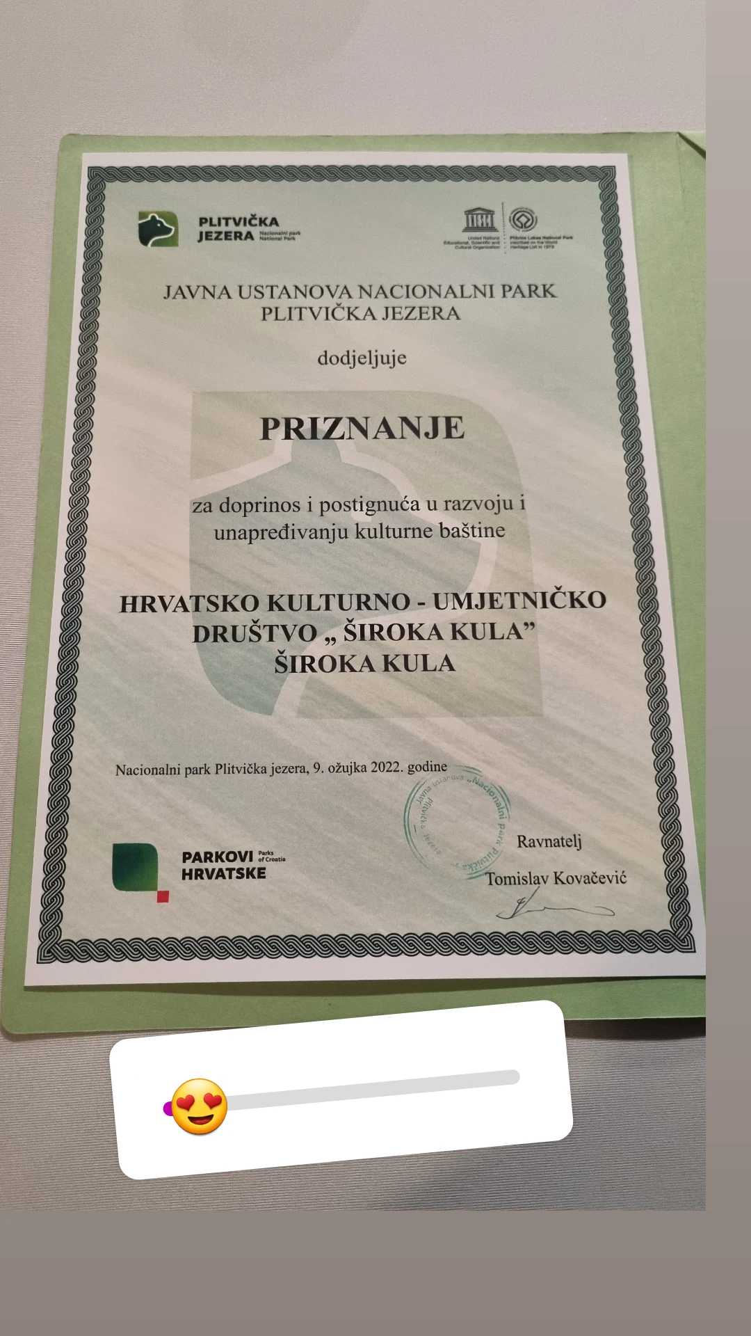 Dugogodišnja suradnja NP Plitvička jezera i HKUD “Široka Kula” rezultirala je hvale vrijednom gestom Parka te je sinoć HKUD-u “Široka Kula” dodijeljeno priznanje za doprinos i postignuća u razvoju i unapređivanju kulturne baštine od Javne ustanove Nacionalni park Plitvička jezera.