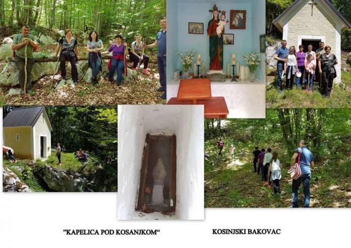 Mjesec Svibanj prikrao se kraju. Prve zrake jutarnjeg sunca obasjale su netaknutu prirodu Kosinjskog Bakovca. Sjesti uz put i uživati u mirisu trave i žuboru raspjevanih cvrčaka prava je milina. No, put nas vodi dalje uz brdo do Kapelice podno Kosanjka. Prolazimo pored stare kuće koja prkosi zubu vremena, svojim postojanjem podsjeća na davnu prošlost. Tu nailazimo na stariju mještanku Katu, dočekuje nas osmjehom i lijepim riječima znajući gdje smo se uputili. Kroz razgovor primjećujemo koliko žali za vremenom kad je ovakvih susreta bilo više nego danas. Baš tu pred njenom kućom, hodočasnici bi nakon spuštanja s brda predahnuli. A mještanka Kate bi skuhala kavu, donijela vode za okrijep nakon strme staze i ljetnih vrućina, pa bi se veselo društvo sastalo i zapjevalo. Potrajao bi odmor duže u veselju. No, tako je bilo nekada, na trenutak čovjeka obuzme sjeta na to vrijeme. Ali opraštamo se od naše mještanke i krećemo dalje, ispraća nas govoreći da ne zaboravimo ponijeti štap, koji će nam biti podrška uz brdo ali i zaštita od zmija. Očišćenom stazom približavamo se gustoj šumi, a ona kao da nas pozdravlja i svojim kisikom uspon strmom stazom olakšava. I dok koračam stazom kojom godinama nisam prolazila, prisjećam se prošlosti i priča starih iz tog vremena. Mještani bi s koljena na koljeno prenosili priču o djevojci koja je na na mjestu sadašnje kapelice čuvala ovce. Bijaše tu proplanak kojeg je u dolini manjkalo, jer tada su pašnjaci bili puni. Jednog dana na tom mjestu djevojci se ukazala Marija Majka Božja. Djevojka je prenijela mještanima Bogorodičinu poruku, >na ovom mjestu sagradite Kapelicu>. Ne oklijevavši, mještani se odluče i sagradiše Oltar Majci Božjoj podno Kosanjka. Došavši do Kapelice na dan kad se treba slaviti Sv.misa, izmjenjivao se osjećaj tuge i radosti. Spokoj guste šume prekidao je poneki cvrkut ptica i raspjevanog cvrčka. Uokolo Kapelice stoje prazne klupe i čekaju na putnika koji će ovdje sjesti, u tišini sa bogom razgovarati i dušu od svakidašnjice odmoriti. Sv.misa je otkazana, održat će se u crkvi Sv. Vida u Kosinjskom Bakovcu. No mi smo odlučili za ovaj dan zahvaliti Majci Božjoj pod Kosanjkom. Nakon zajedničke molitve, prepričavali smo prošlost, sve ono sto su nam stariji u djetinjstvu o ovom mjestu kroz priču prenijeli. Zaboravljena u šumi sakrivena, Kapelica nekada pjesmom, molitvom i Ličkim kolom slavljena, danas na svoj dan zaboravljena. I tako je ova subota svoj smisao dobila. I tko zna, možda se opet nakon dugo vremena ova kapelica podno Kosanjka sa više mještana i putnika namjernika bude slavila.