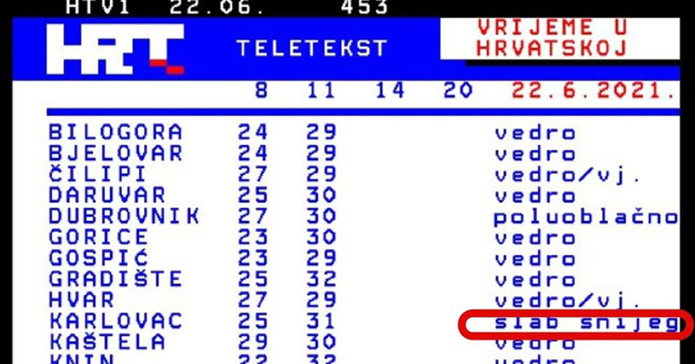 Ipak, kako kaže teletekst HRT-a, Karlovčani danas imaju najviše sreće te kod njih, uz temperaturu od 31 stupnja, pada slab snijeg.