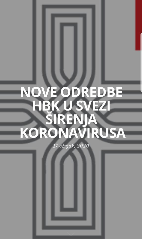 Svjesni situacije i odgovornosti za zdravlje i život vjernika, a u skladu s najnovijim mjerama Nacionalnog kriznog stožera, Hrvatskog zavoda za javno zdravstvo i Ministarstva zdravstva, Hrvatski biskupi donose mjere koje stupaju na snagu u srijedu, 18. ožujka 2020. u 00:00 i traju do drugačije odluke.
