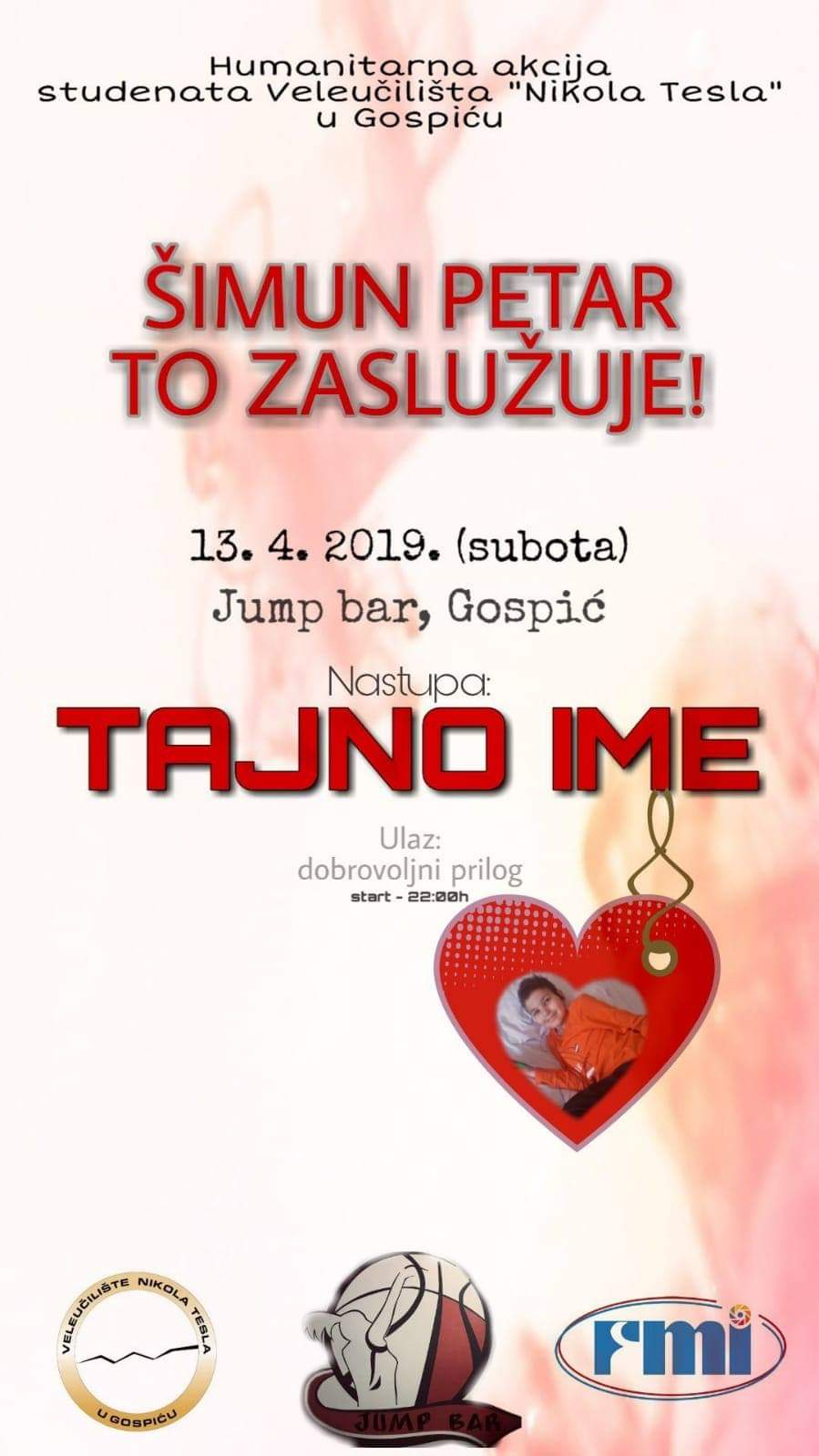 Ovim putem studenti Veleučilišta „Nikola Tesla“ u Gospiću pokrenuli su humanitarnu akciju ŠIMUN PETAR TO ZASLUŽUJE uoči koje će u subotu 13.04.2019. s početkom u 22 sata u Jump baru u gradu Gospiću nastupati grupa Tajno ime, a na ulazu će se prikupljati dobrovoljni prilog koji će biti uplaćen na račun Šimuna Petra Marune.