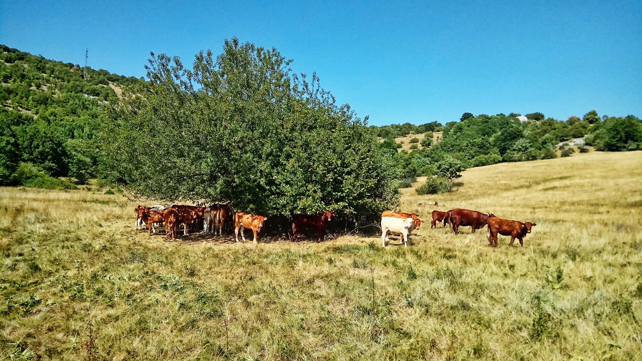 Danas smo u automobilu izmjerili čak 43 stupnja. Na Ljubovu je bilo nešto hladnije – točnije 39 stupnjeva.  Iako malo hladnije nego u ostatku Like, krave na Ljubovu su se borile za svoje mjesto ispod drveta kako bi se sakrile od sunca.