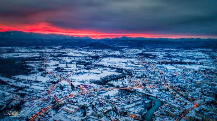 Ovu je scenu zaista najbolje promatrati doma, u toplom. Uza svu ljepotu i romantičnu moć zimske večeri nad Gospićem vani je sve hladnije, a prozirna zimska kapa na Velebitu odaje nam bliskost bure i još veće hladnoće. Na Jadranu i u Lici.