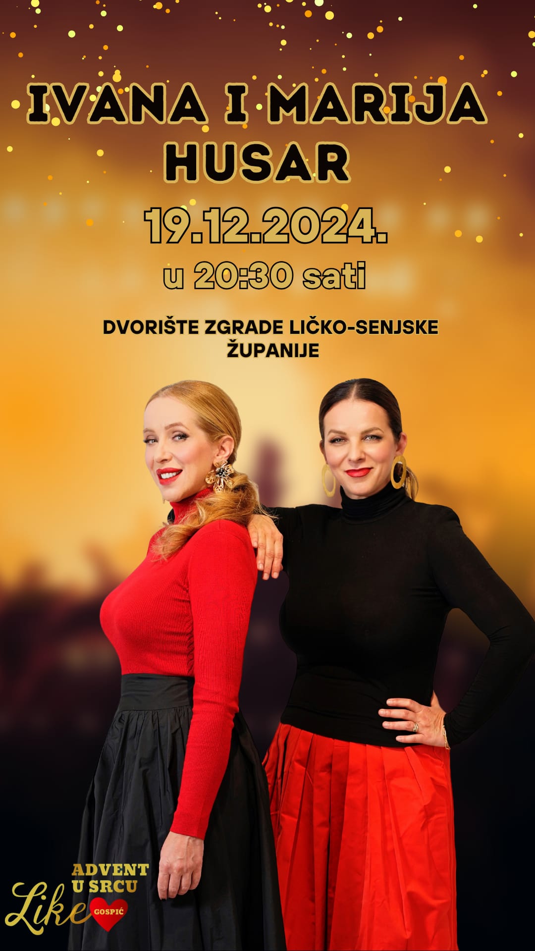U sklopu manifestacije “Advent u srcu Like”, ljubitelji glazbe moći će uživati u nastupu Ivane Husar i Marije Husar Rimac. Koncert će se održati 19. prosinca 2024. godine u dvorištu zgrade Ličko-senjske županije s početkom u 20:30 sati.