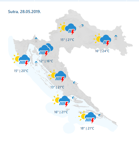 Mogući izraženi grmljavinski pljuskovi. vjerojatnost grmljavine 50-80 % BUDITE NA OPREZU zbog mogućih jačih grmljavinskih nevremena. Posebno pripazite u izloženim područjima kao što su planine, šume i livade odnosno otvoreni tereni. Mogući su prekidi u aktivnostima na otvorenom.