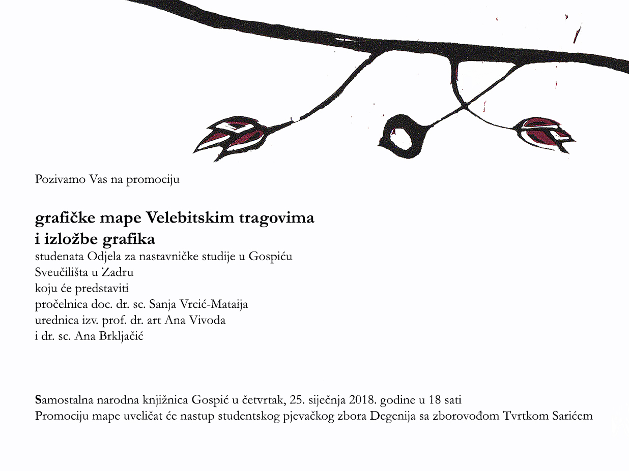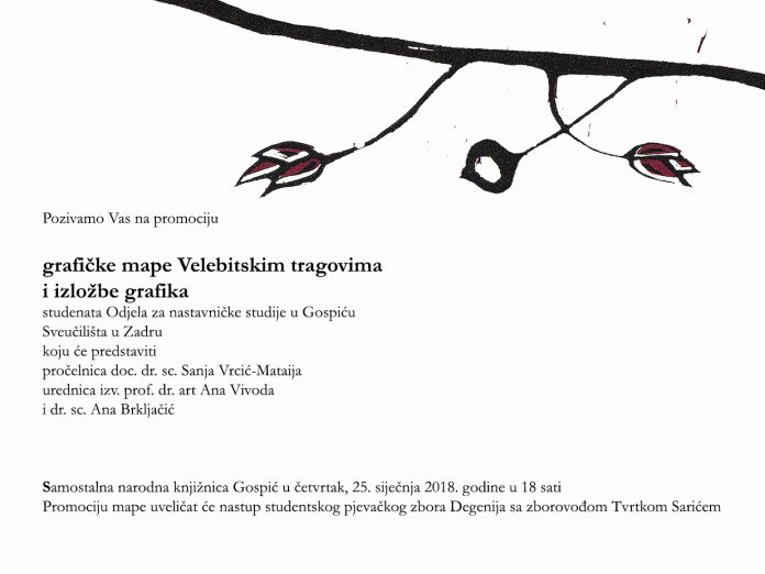 Odjel za nastavničke studije u Gospiću, Sveučilišta u Zadru, obavijestio je danas javnost o održavanju zanimljive i svakako atraktivne izložbe. Tako će se u četvrtak, 25. siječnja 2018. godine s početkom od 18 sati u Samostalnoj narodnoj knjižnici u Gospiću održati promocija grafičke mape „Velebitskim tragovima“ i izložba grafika studenata Odjela za nastavničke studije u Gospiću.