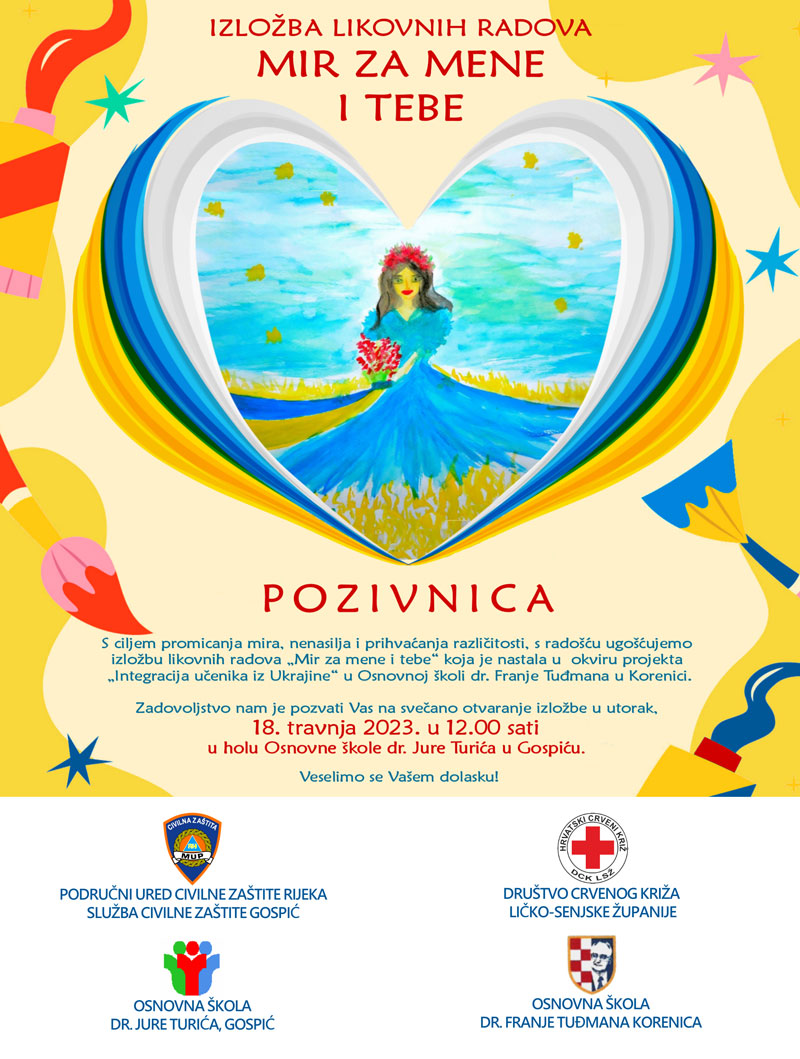 S ciljem promicanja mira, nenasilja i prihvaćanja različitosti, s radošću ugošćujemo izložbu likovnih radova „Mir za mene i tebe“ koja je nastala u okviru projekta „Integracija učenika iz Ukrajine“ u Osnovnoj školi dr. Franje Tuđmana u Korenici.