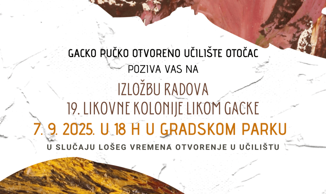 Otvorenje izložbe radova 19. likovne kolonije LIKOM GACKE održat će se u nedjelju, 7. rujna 2025. godine u 18 sati u gradskom parku u Otočcu. Izložba će predstaviti oko 40 radova nastalih na ovogodišnjoj likovnoj koloniji koju organizira Gacko pučko otvoreno učilište Otočac.