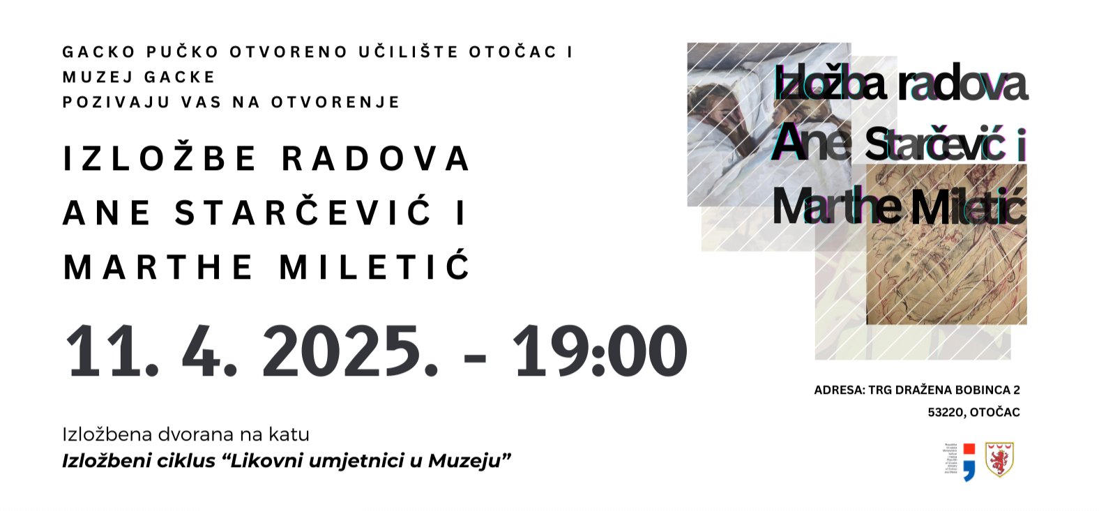 U petak, 11. travnja 2025. godine u 19 sati u Muzeju Gacke pri Gackom pučkom otvorenom učilištu Otočac bit će otvorena izložba radova Ane Starčević i Marthe Miletić, mladih autorica, članica Likovne udruge Lika.