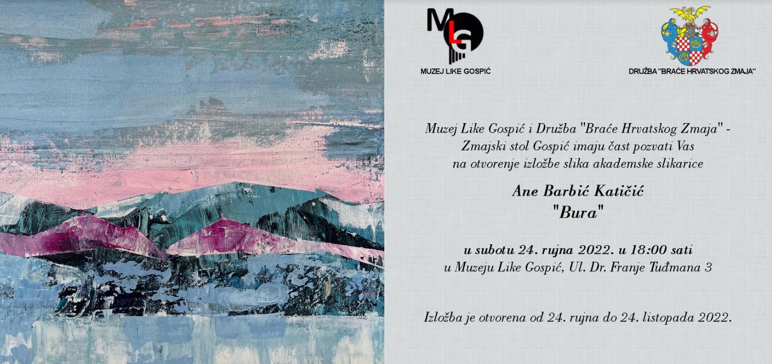 O divoti bure i pronalaženju njezinih skrivenih atributa govorili su i danas govore mnogi umjetnici. Svatko kroz svoj medij slali su svijetu poruku o vjetru toliko karakterističnom za ovaj dio svijeta. Tako će nam ove subote, 24. rujna, o buri pričati djela Ane Barbić Katičić, akademske slikarice čija djela ćemo gledati u Muzeju Like Gospić od 18 sati. Izložbu organiziraju Muzej i Družba „Braća Hrvatskog Zmaja“-Zmajski stol Gospić.