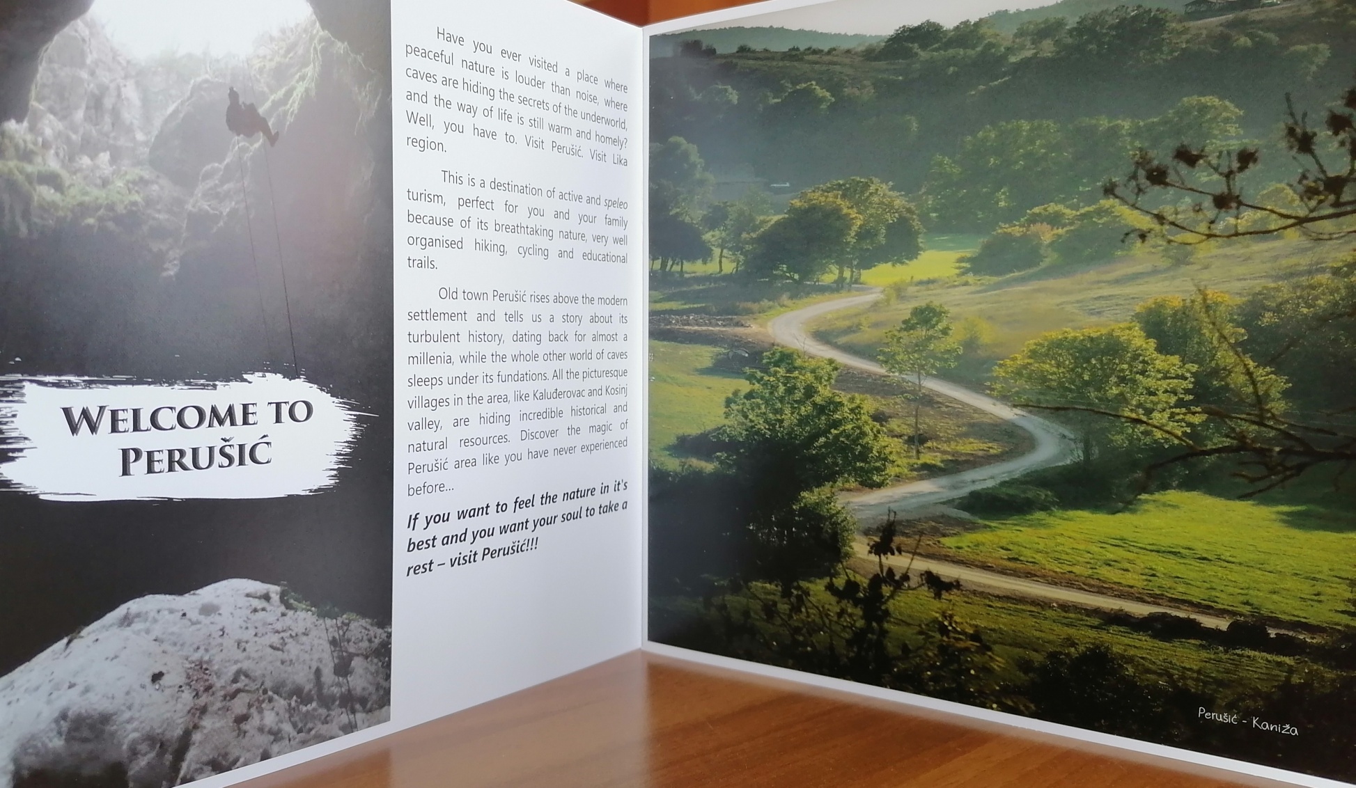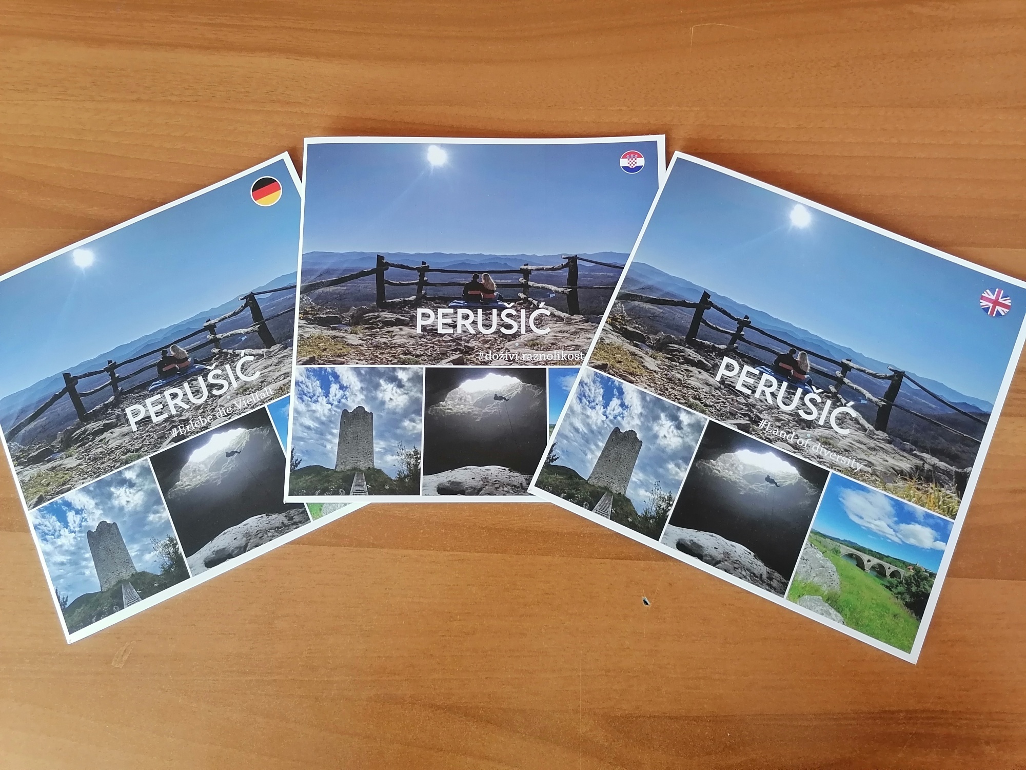 Brošura je tiskana u tri jezične verzije (hrvatski, engleski i njemački). Prezentacija destinacije se temelji na atraktivnim fotografijama, kojima smo posvetili posebnu pažnju da na što ljepši način vizualno približimo Perušić onima koji ga tek trebaju posjetiti. Brošura objedinjuje cjelokupnu turističku ponudu općine Perušić, njezine kulturno-povijesne znamenitosti, prirodnu baštinu, aktivni odmor te smještajnu i ugostiteljsku ponudu.