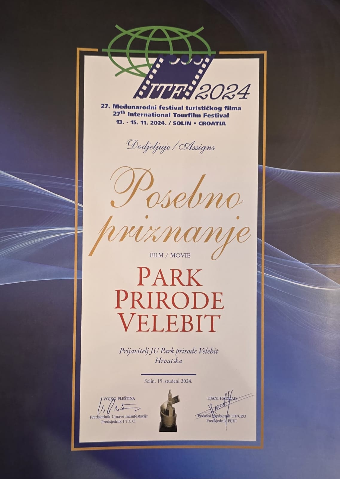 Na 27th ITF’CRO/ Međunarodnom festivalu turističkog filma održanog 13, 14 i 15. 11. 2024. u gradu Solinu, u okviru projekta pod nazivom SOLIN CROATIA – MEĐUNARODNI DANI TURIZMA, TURISTIČKOG FILMA, KRAJOBRAZA, Javna ustanova “Park prirode Velebit” dobila je posebno priznanje za promotivni film Parka prirode Velebit.
