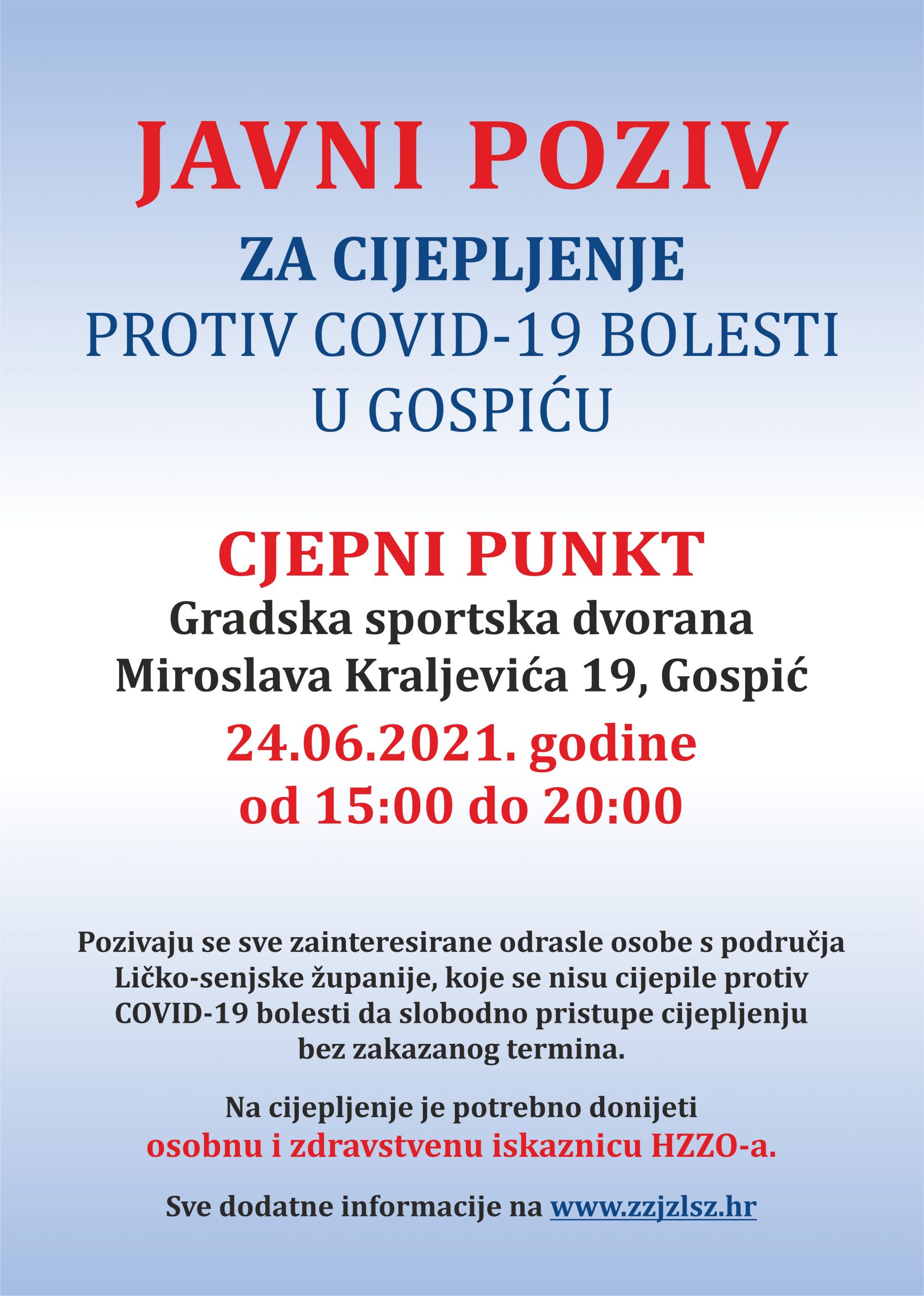 Dana 24.06.2021. Zavod za javno zdravstvo Ličko-senjske županije, Dom zdravlja Gospić i Zavod za hitnu medicinu Ličko-senjske županije organiziraju cjepni punkt u Gradskoj sportskoj dvorani Gospić (Miroslava Kraljevića 19, 53000 Gospić) za sve zainteresirane osobe s područja Ličko-senjske županije koje još nisu cijepljene.