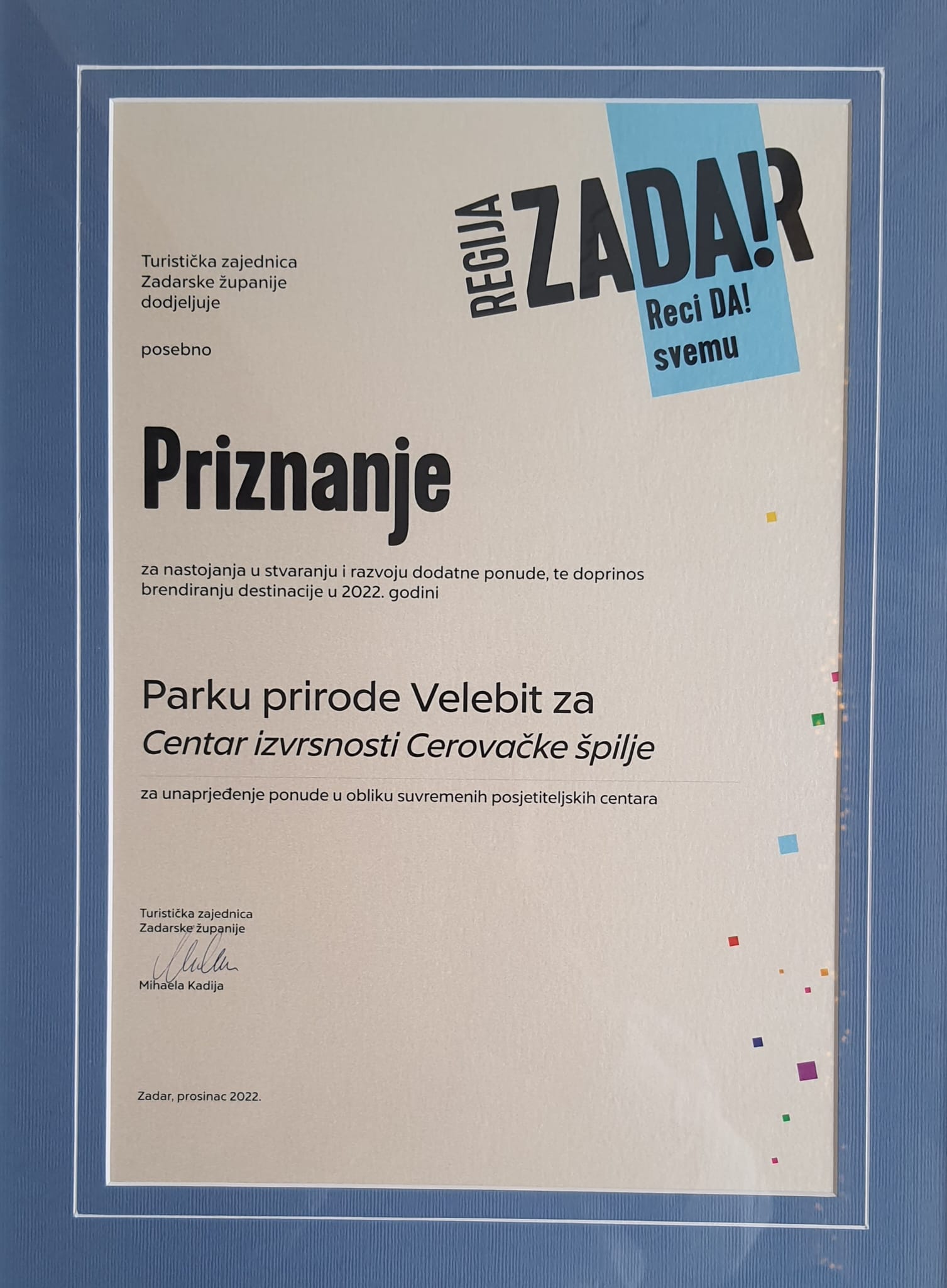 Tom prigodom Javnoj ustanovi Parku prirode Velebit dodijeljena je posebna nagrada za unaprjeđenje ponude u obliku suvremenih posjetiteljskih centara za Centar izvrsnosti Cerovačke špilje a je nagradu zasluženo preuzeo ravnatelj Ustanove Mario Šaban.