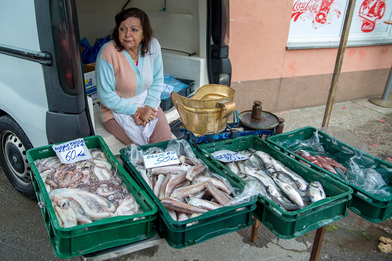 Štand morske ribe je slabo posjećen, ali je zato kod svježe pastrve gužva.