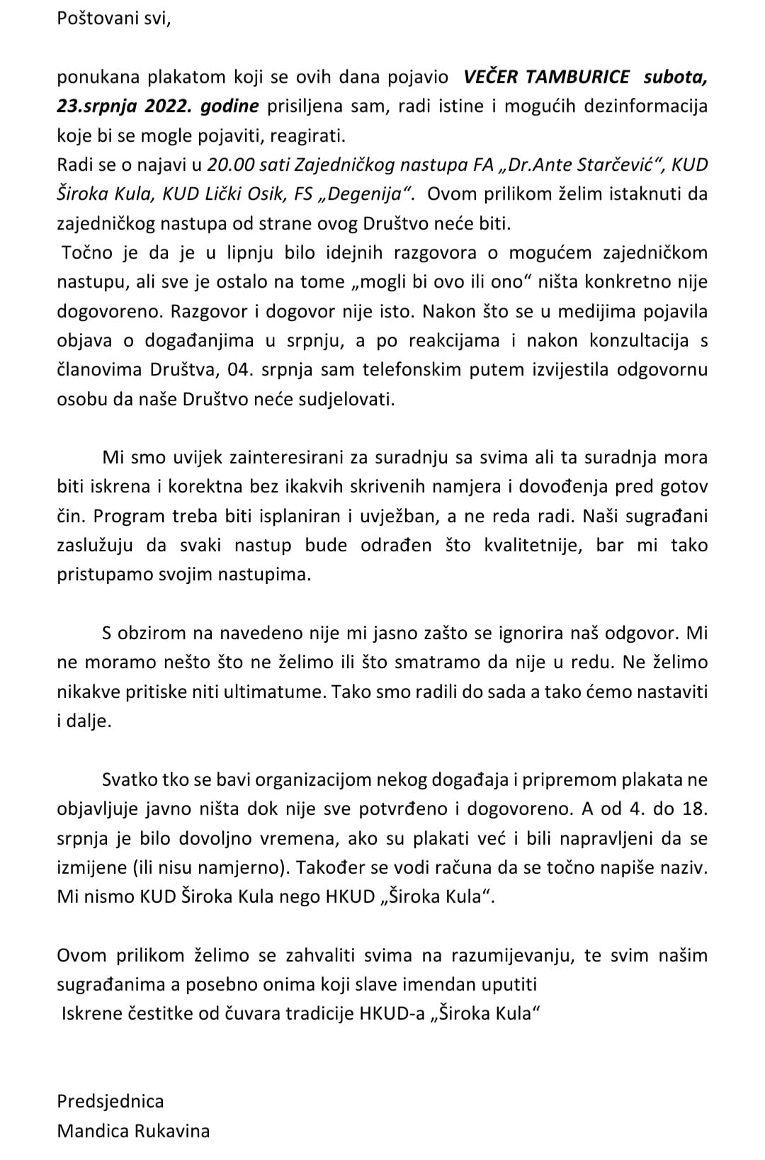 Predsjednica Društva HKUD Široka Kula  Mandica Rukavina obratila se organizatorima i javnosti, s ciljem ispravka netočnih navoda od strane nekoga tko je o tome trebao voditi brigu.