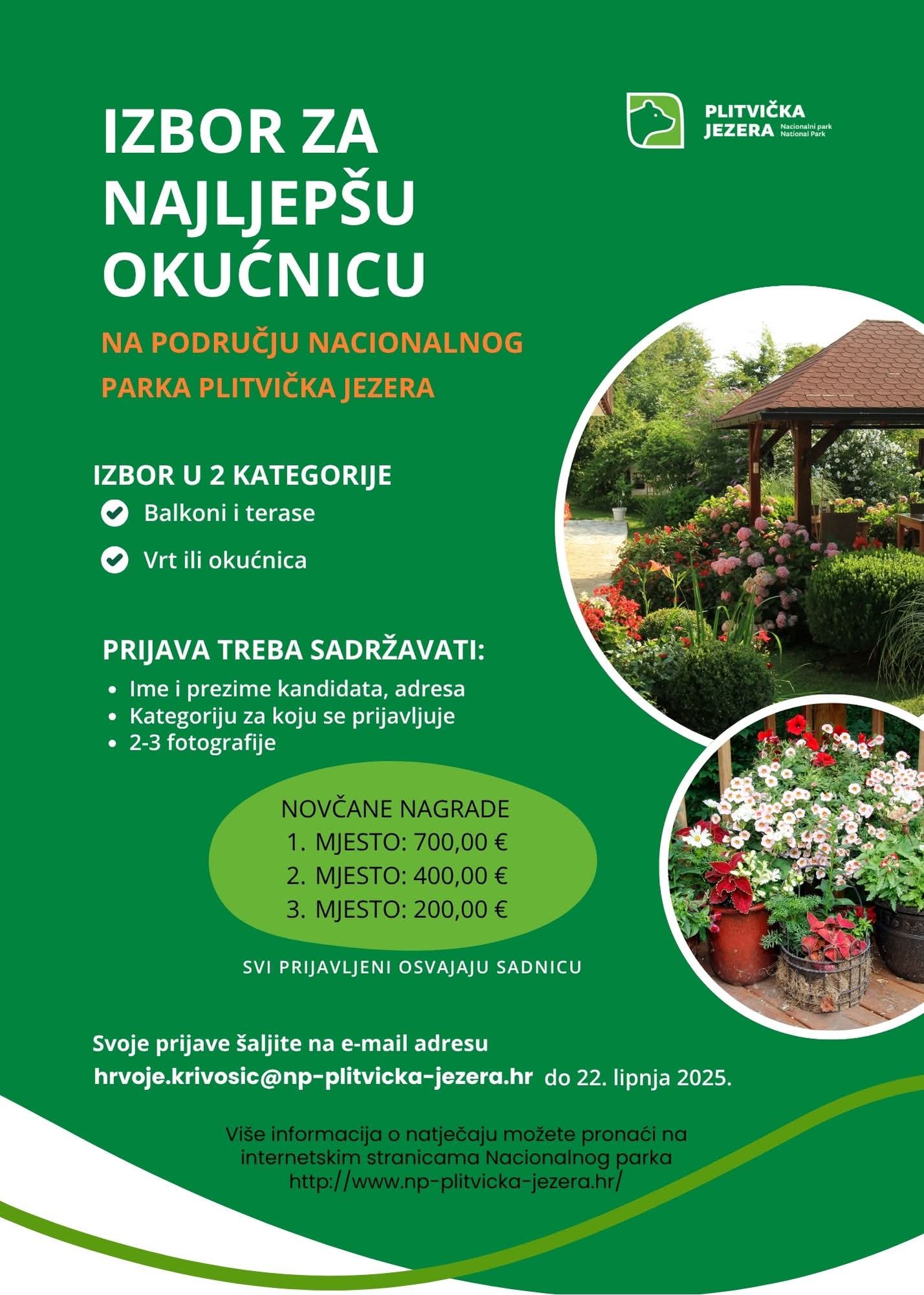 Svi koji smatraju da imaju najljepšu okućnicu, vrt, balkon ili terasu na području općina Plitvička Jezera, Vrhovine, Rakovica ili Saborsko još uvijek se stignu prijaviti na Natječaj za izbor najljepše okućnice 2025., koji provodi Nacionalni park Plitvička jezera.