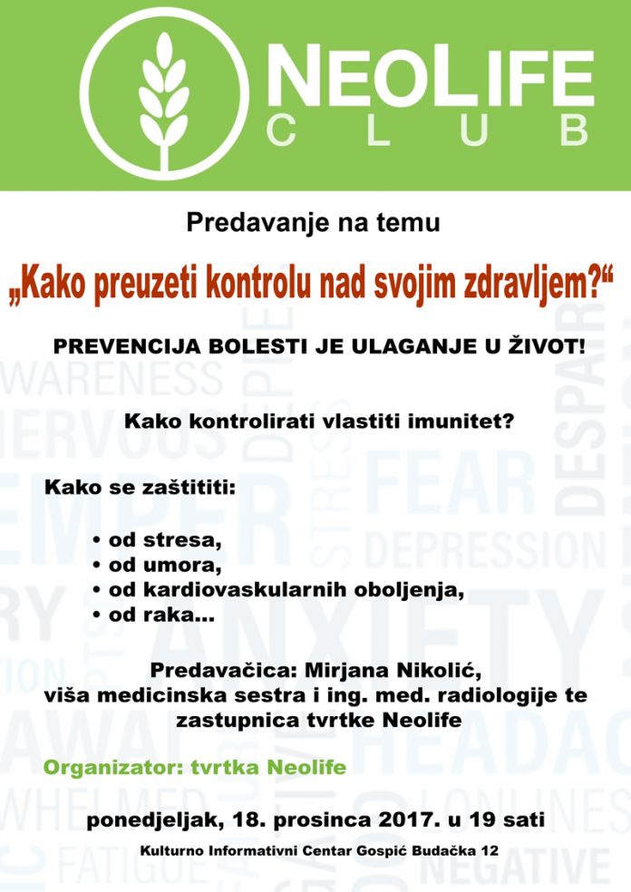 Saznajte što sve možete učiniti kako biste kontrolirali vlastiti imunitet, kako biste se zaštitili od stresa, umora, kardiovaskularnih oboljenja, raka… Važno je imati na umu da je prevencija bolesti ulaganje u život! Predavačica: Mirjana Nikolić, viša medicinska sestra i ing. med. radiologije te zastupnica tvrtke Neolife
