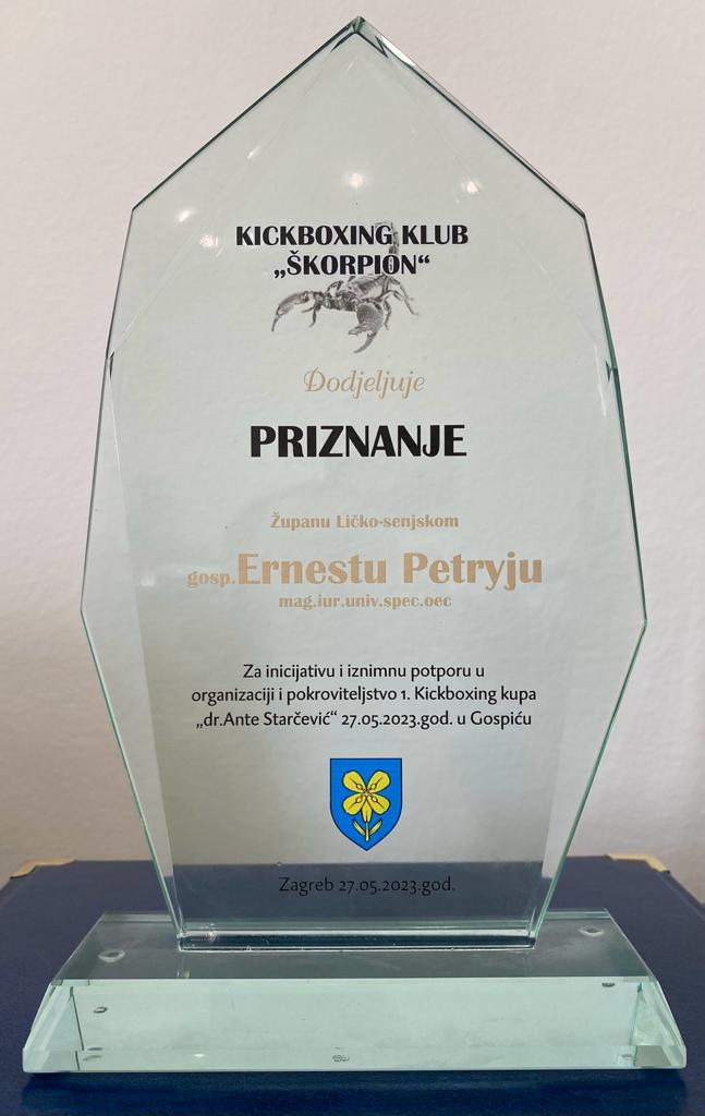 Kickboxing klubu “Škorpion” iz Zagreba dodijelio je priznanje ličko-senjskom županu Ernestu Petryju radi inicijative i potpore u organizaciji 1. Kickboxing kupa “dr. Ante Starčević”, koji se održao 27. svibnja 2023. godine u Gospiću, povodom obilježavanja Dana Ličko-senjske županije i 200. godišnjice od rođenja dr. Ante Starčevića.