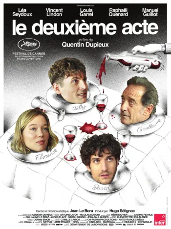 “Drugi čin” nova je komedija apsurda istaknutog francuskog redatelja Quentina Dupieuxa. Riječ je o filmskoj farsi u kojoj glumci tumače dvostruke uloge u produkciji koja vrlo brzo izmiče kontroli.
