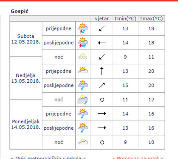 Djelomice sunčano uz promjenljivu naoblaku, ujutro u unutrašnjosti i mjestimičnu maglu. Uz jači razvoj oblaka lokalno može biti kiše ili pljuskova praćenih grmljavinom, osobito u gorskim područjima i unutrašnjosti Dalmacije, češće u drugom dijelu dana. Vjetar većinom slab, ujutro podno Velebita umjerena bura. Najviša dnevna temperatura između 22 i 27 °C, u gorju i malo niža.
