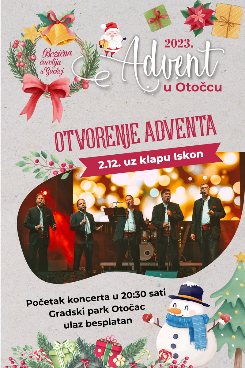 Jedna od najboljih Hrvatskih klapa otvorit će ovogodišnji Advent u Otočcu i uvesti nas u čarobni prosinac koji će biti pun koncerata, radionica, plesnih programa i zabave za sve uzraste. Otočki gradski park i ovog će prosinca biti središte svih događanja, a uz bogat zabavni program bit će tu klizalište i ugostiteljska pouda.