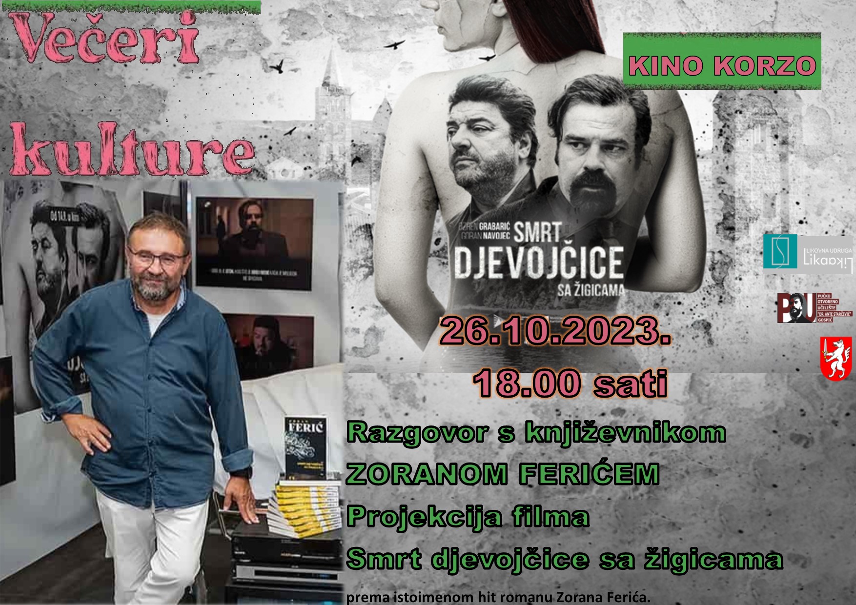 Književne večeri još su jedna u nizu aktivnosti Večeri kulture. U četvrtak 26.10.2023. godine u Kinu Korzo s početkom u 18.00 sati u goste nam dolazi pisac Zoran Ferić. Nakon razgovora s autorom projekcije filma “Smrt djevojčice sa žigicama” redatelja Gorana Kulenovića. Film se temelji na istoimenom hit romanu Zorana Ferića. Moderatorica Josipa Milinković. Program je financiran sredstvima Grada Gospića, a provodi se u organizaciji Likovne udruge Lika. Partner je POU Gospić.