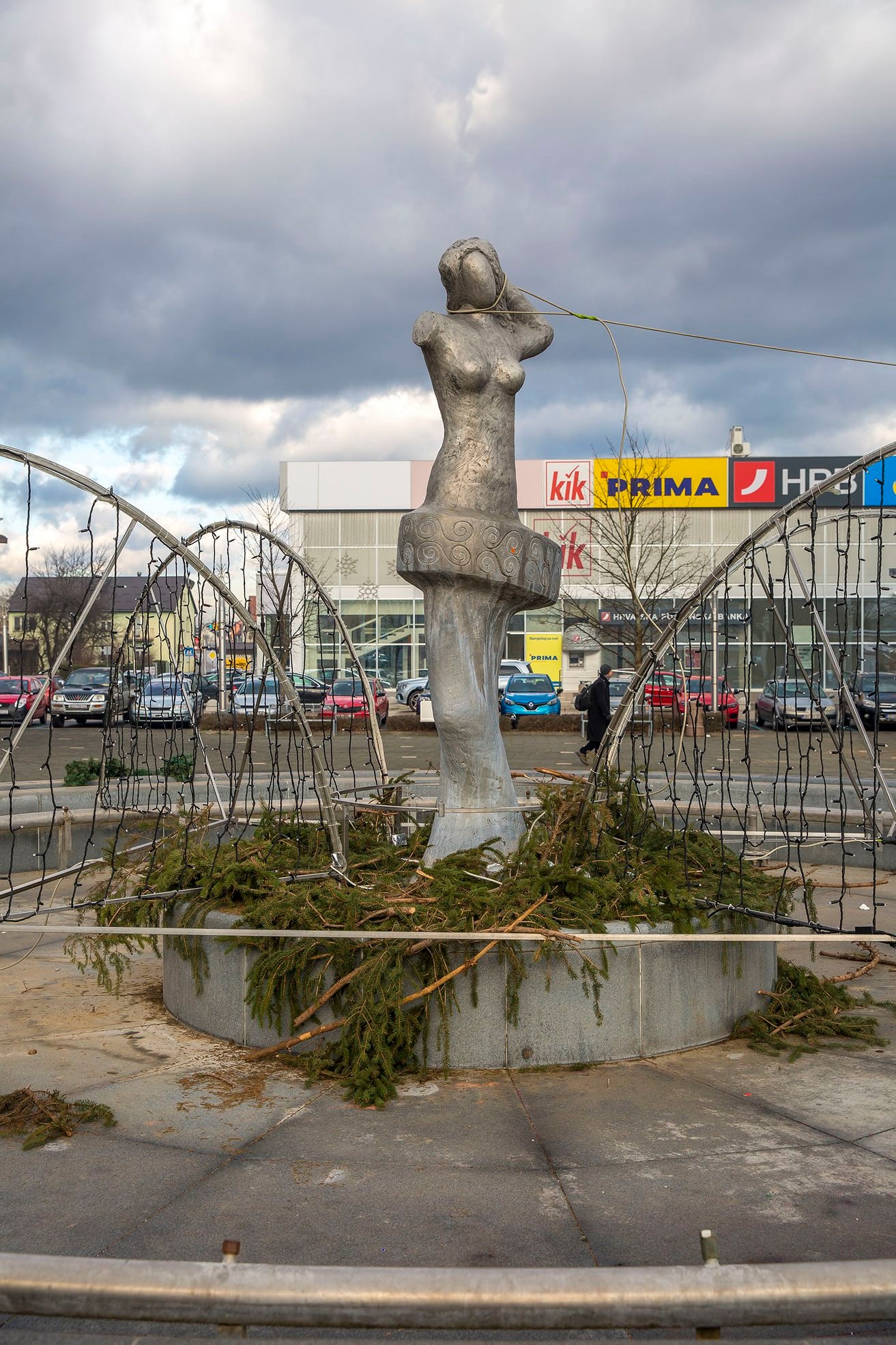 Fontana Vila Velebita svakako je predivni detalj Trga Stjepana Radića. Netko jako domišljat spojio je preko kipa kabel za struju. Kako??? Tako što je Vilu Velebita doslovno „objesio“ žicom. Ta ružna scena stoji već dulje od mjesec dana i nikako da je netko makne. Po onoj staroj poslovici „ako laže koza-ne laže rog“ dovoljno je pogledati ove fotografije. Na koje će prozvane veličine reagirati kao na napad na njih osobno. To je zato što su neki od njih diplomirali umijeće laganja.