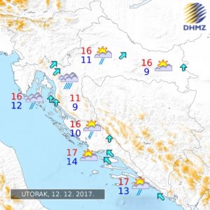 Umjereno do pretežno oblačno, vjetrovito i osobito na kopnu osjetno toplije nego jučer. Povremeno će biti kiše, uglavnom na Jadranu i u područjima uz Jadran. Kiša će biti češća u prvom dijelu dana, a oborine mjestimice mogu biti obilnije, osobito na širem riječkom području. Puhat će umjeren do jak, na udare osobito u gorju olujan jugozapadni vjetar, na Jadranu jako i olujno jugo. Najviša dnevna temperatura uglavnom između 10 i 16 °C.