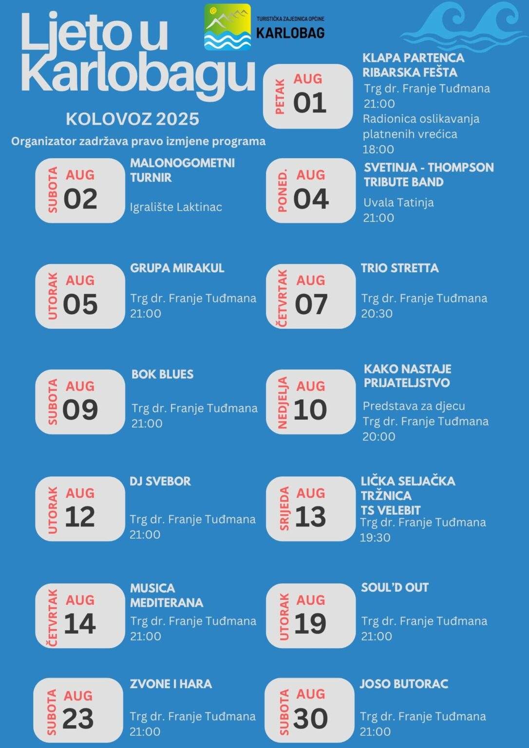 Turistička zajednica Općine Karlobag pripremila je raznovrstan kulturno-zabavni program pod nazivom „Ljeto u Karlobagu“, koji će tijekom kolovoza 2025. godine oživjeti centar mjesta i okupiti brojne posjetitelje iz svih krajeva Hrvatske i inozemstva.