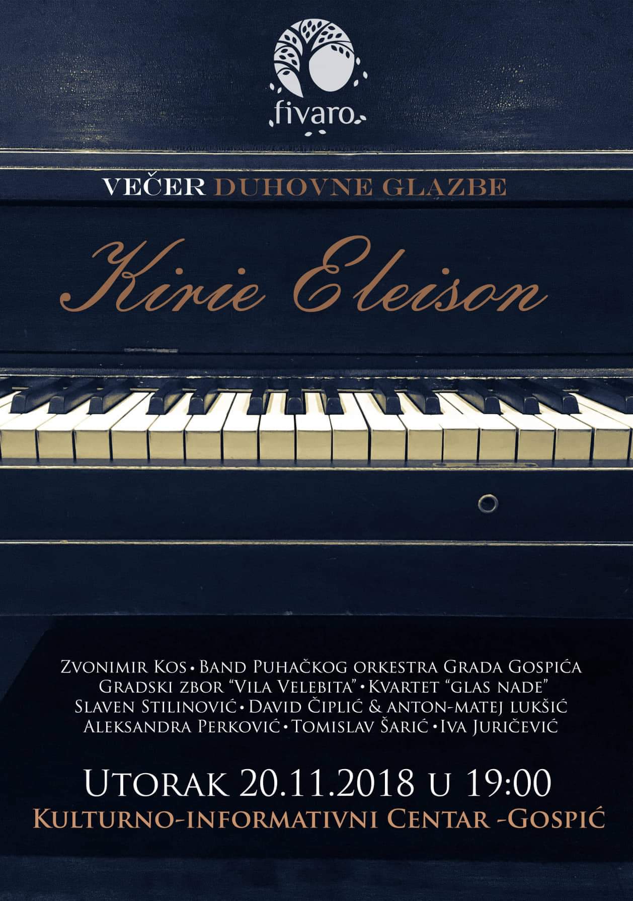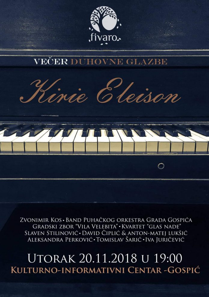 Kirie Eleison naziv je koncerta duhovne glazbe koji će nas uvesti u  blagdansko ozračje Božića. U utorak, 20. studenoga u dvorani Kulturno-informativnog centra Gospić s početkom od 19 sati uz posebno odabrani repertoar slušat ćemo kvartet „Glas nade“, grupu Puhačkog orkestra grada Gospića, Gradski pjevački zbor „Vila Velebita“, Slavena Stilinovića, Davida Čiplića i Antona Mateja Lukšića, Zvonimira Kosa, Tomislava Šarića, Aleksandru Perković i Ivu Juričević. Ovaj koncert organizirala je Udruga „Fivaro“ iz Gospića koja promiče cjelovitost zdravlja i svrhovitost  života.
