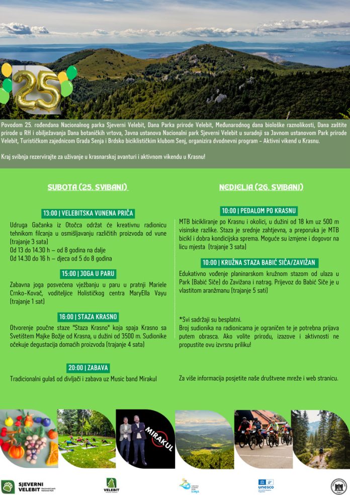 Povodom 25. rođendana Nacionalnog parka Sjeverni Velebit, Dana Parka prirode Velebit, Međunarodnog dana biološke raznolikosti, Dana zaštite prirode u RH i obilježavanja Dana botaničkih vrtova, Javna ustanova Nacionalni park Sjeverni Velebit u suradnji sa Javnom ustanovom Park prirode Velebit, Turističkom zajednicom Grada Senja i Brdsko biciklističkim klubom Senj, organizira dvodnevni program – Aktivni vikend u Krasnu.