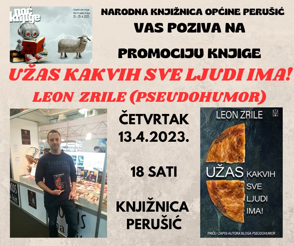 Narodna knjižnica Općine Perušić ugostiti će u četvrtak, 13. travnja 2023. godine, s početkom u 18 sati Leona Zrilu, poznatog blogera pod imenom Pseudohumor. Priče sabrane u autorovom prvijencu Užas kakvih sve ljudi ima upravo su onaj tip humora potreban za razbijanje tmurnih svakodnevica.