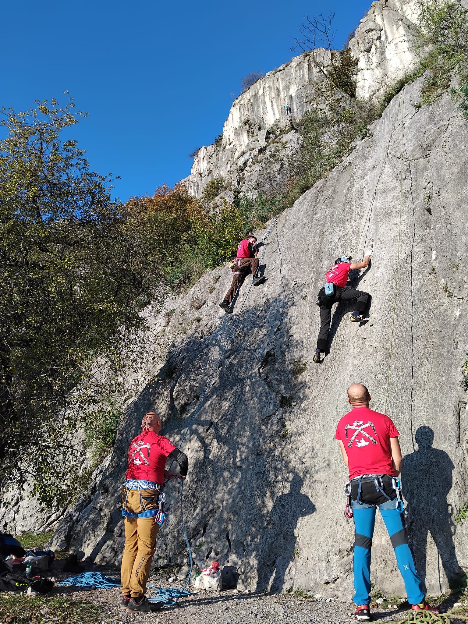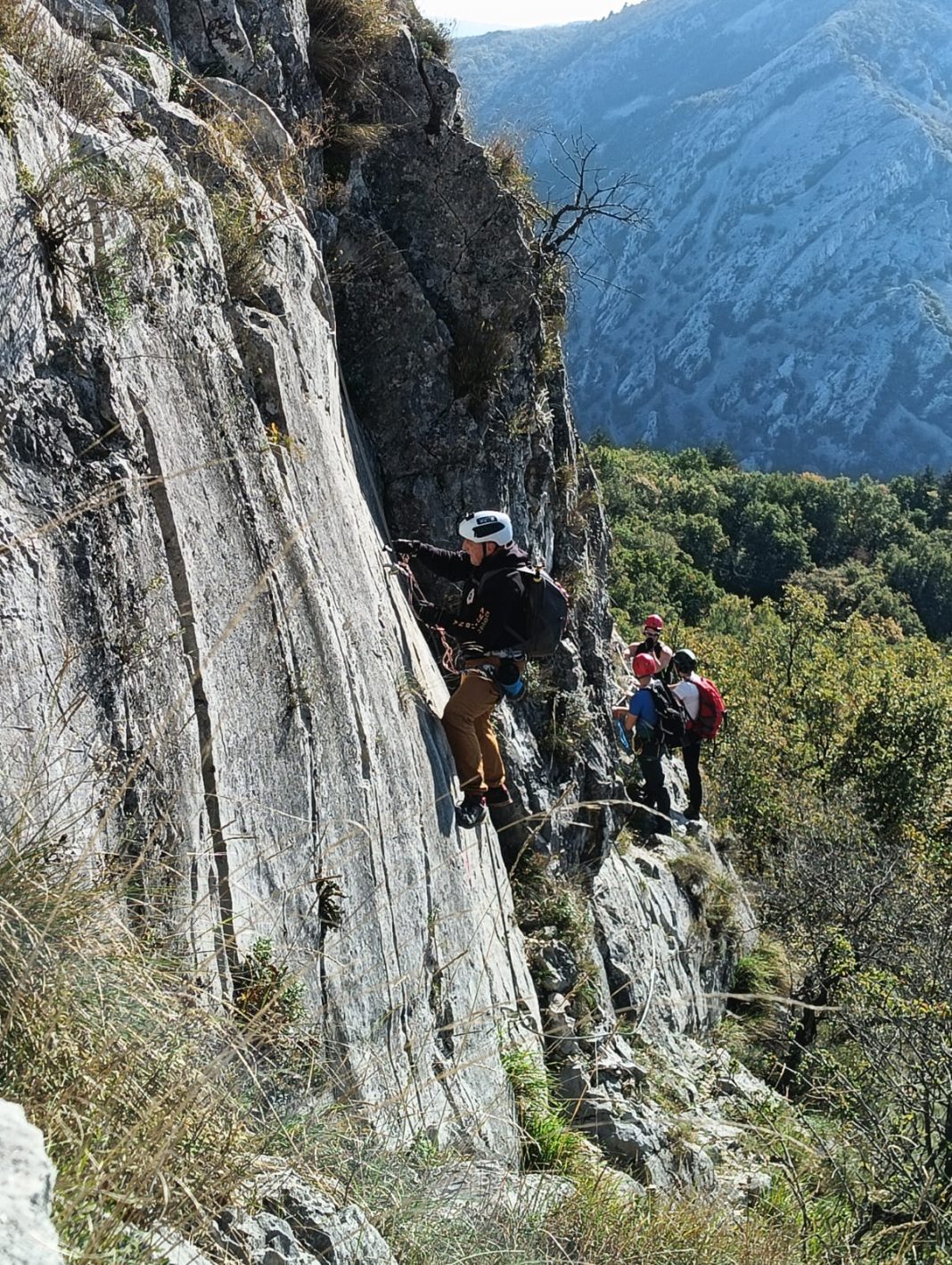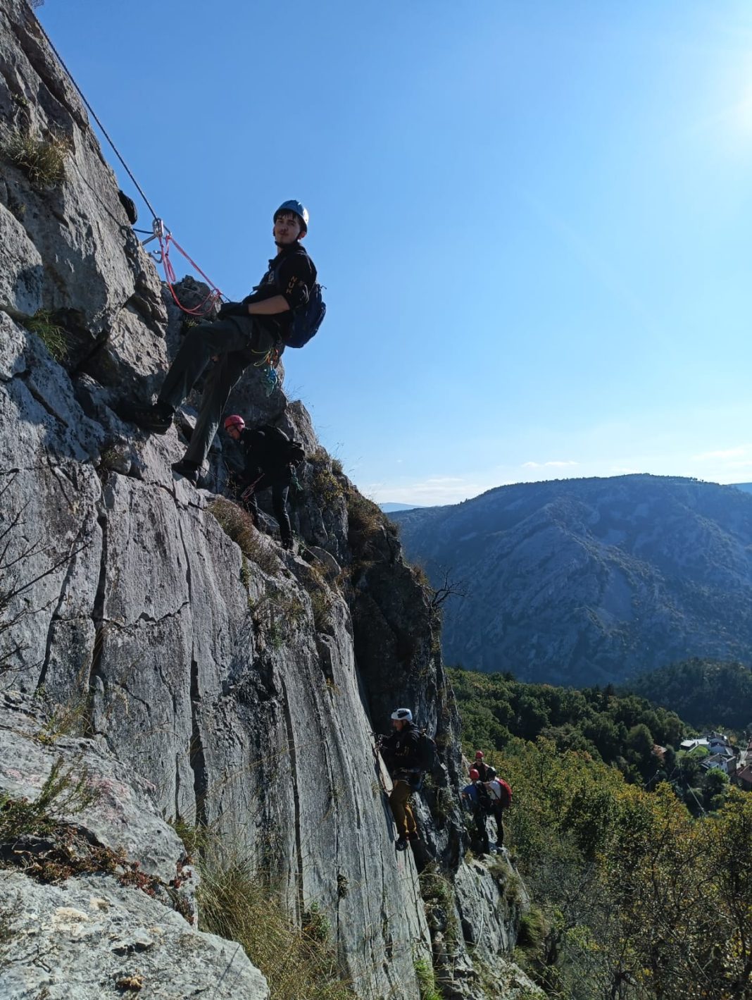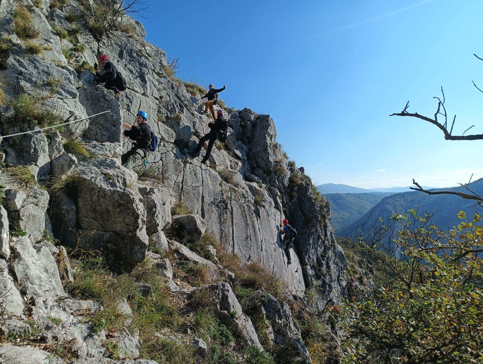 Nakon uvodnog dijela, grupa je uspješno prošla via ferratu “Bruno Biondi” u blizini Trsta, gdje su polaznici imali priliku primijeniti naučeno u stvarnim uvjetima. Penjanje po ovoj atraktivnoj ferrati pružilo je i izazov i užitak, uz predivne poglede na Jadransko more i okolni krški krajolik.