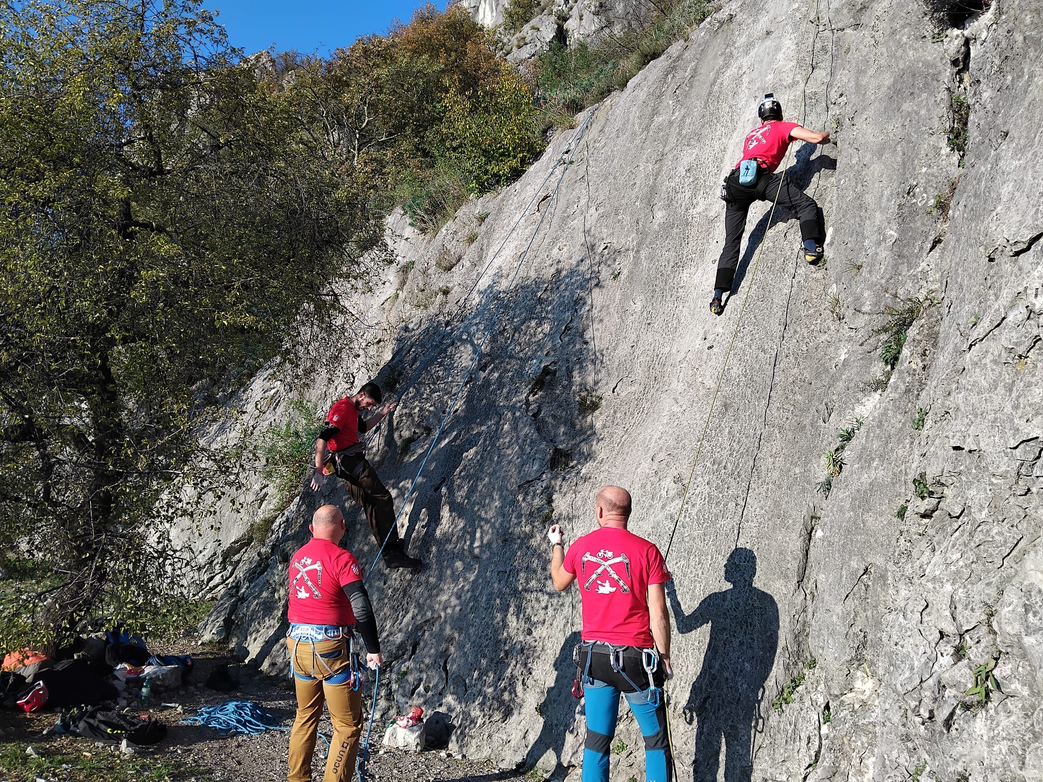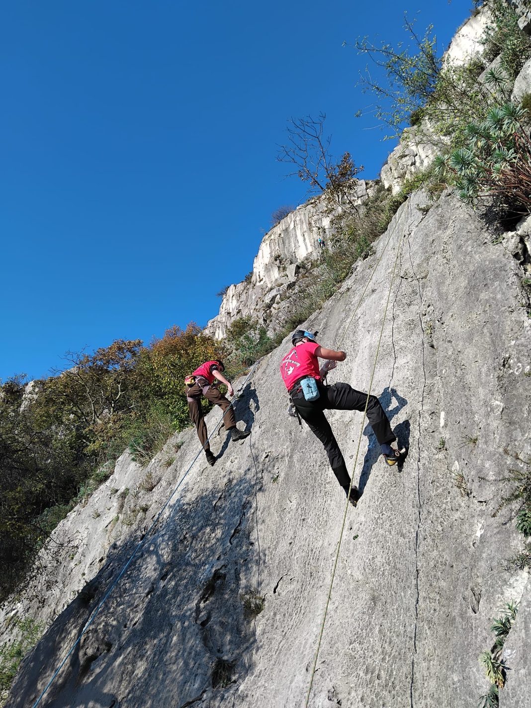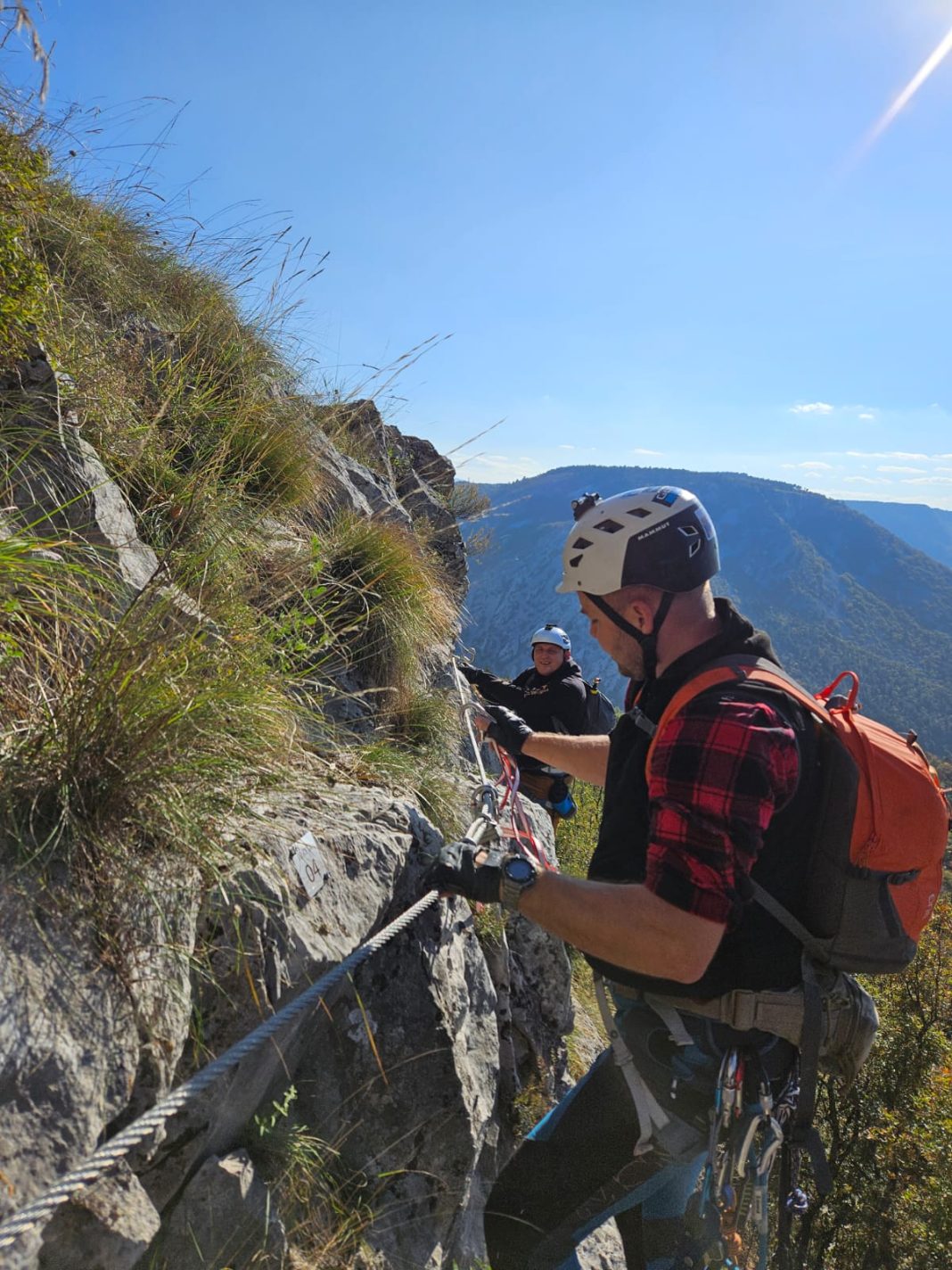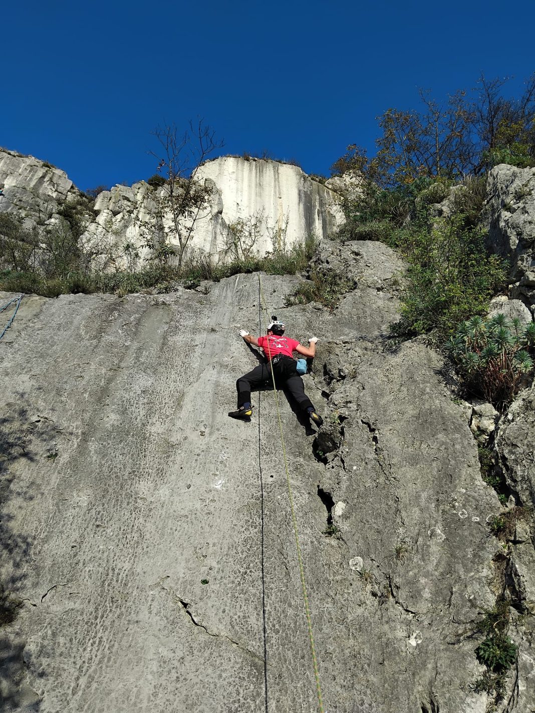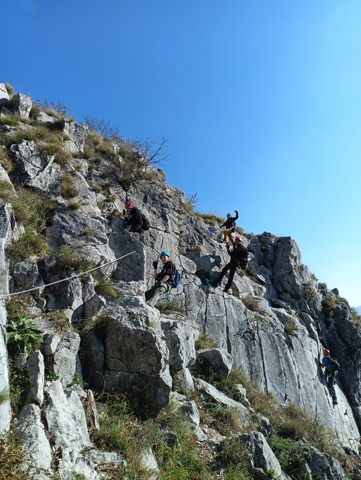 Nakon uvodnog dijela, grupa je uspješno prošla via ferratu “Bruno Biondi” u blizini Trsta, gdje su polaznici imali priliku primijeniti naučeno u stvarnim uvjetima. Penjanje po ovoj atraktivnoj ferrati pružilo je i izazov i užitak, uz predivne poglede na Jadransko more i okolni krški krajolik.
