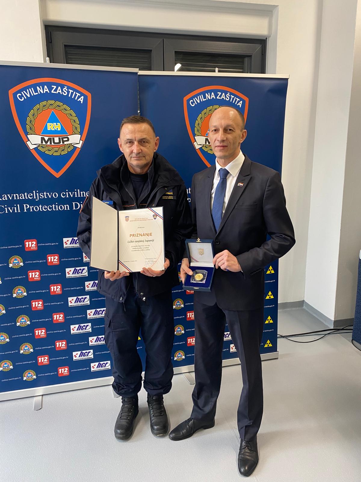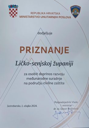 Navedenom prigodom Ličko-senjskoj županiji dodijeljeno je priznanje za osobit doprinos radi provedbe međunarodne suradnje u području sustava civilne zaštite.