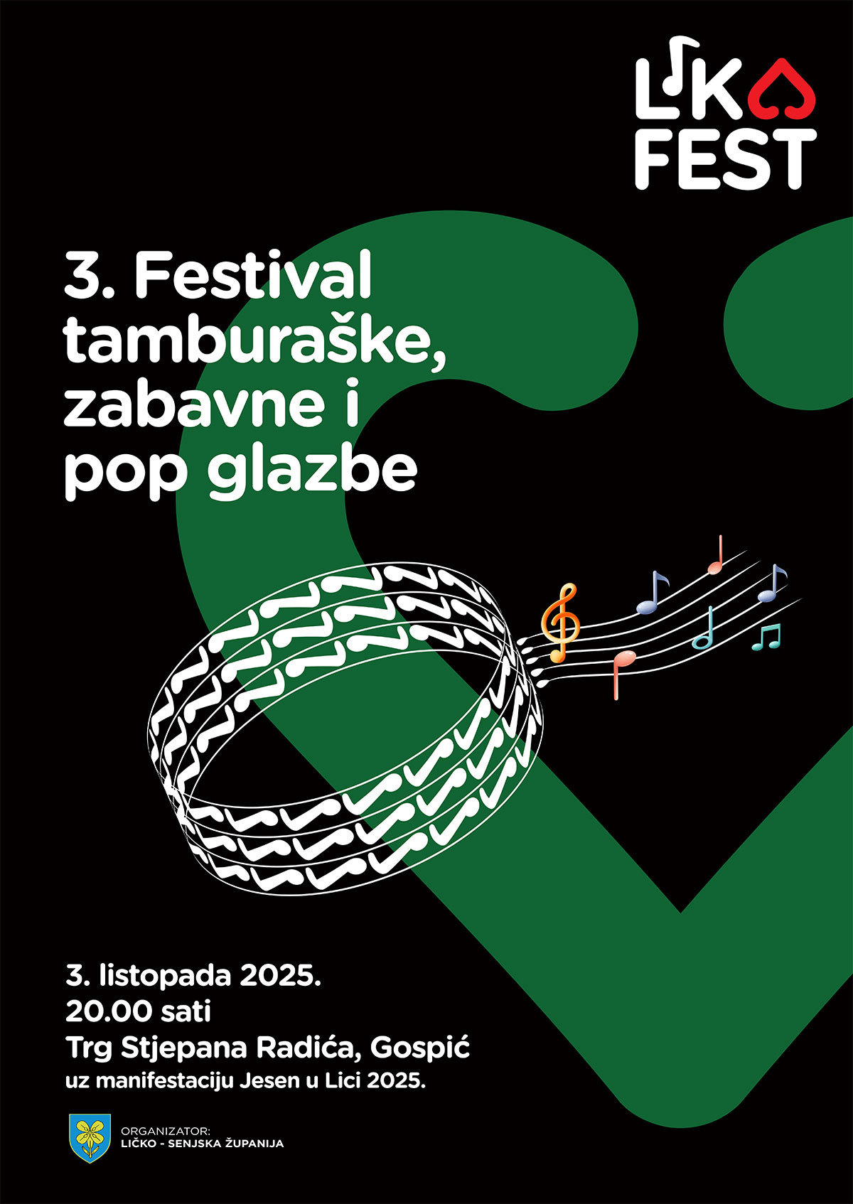 Manifestacija „Jesen u Lici“ i ove će godine Gospiću donijeti bogatstvo tradicije, okusa i glazbe. U sklopu programa, na Trgu Stjepana Radića, u petak 3. listopada s početkom u 20 sati, održat će se 3. Festival tamburaške, zabavne i pop glazbe – Lika Fest 2025.