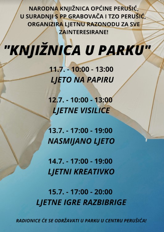 U hladovini parka u centru Perušića, od 11. do 15. srpnja, bit će organizirane kreativne i zabavne ljetne radionice. U ponedjeljak, 11. srpnja, u vremenu od 10 do 13 sati prenijet će se ljeto na papir izradom ljetnih umjetničkih djela. U utorak, 12. srpnja, u vremenu od 10 do 13 sati djeca će ukrasiti grane drveća u parku ljetnim „visilicama“. Smijeha neće nedostajati na kreativnoj radionici Nasmijano ljeto u srijedu, 13. srpnja u vremenu od 17 do 19 sati. U četvrtak, 14. srpnja, u vremenu od 17 do 19 sati očekuje nas Ljetni kreativko pod jednom od brojnih zelenih krošanja parka. Nakon četiri dana kreativnosti i mnoštva radova u petak, 15. srpnja, u vremenu od 17 do 20 sati odigrat će se Ljetne igre razbibrige, kojima će se uz smijeh i zabavu završiti još jedan tjedan „Knjižnice u parku“!