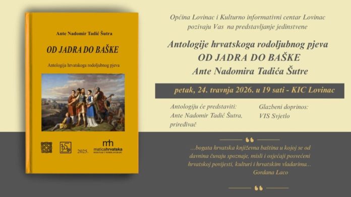U Lovincu će u petak, 24. travnja 2026. godine, biti predstavljena knjiga „Od Jadra do Baške – Antologija hrvatskoga rodoljubnog pjeva“, autora i priređivača Ante Nadomira Tadića Šutre. Predstavljanje će se održati u 19 sati u Kulturno-informativnom centru Lovinac, u organizaciji Općine Lovinac i Kulturno-informativnog centra Lovinac.