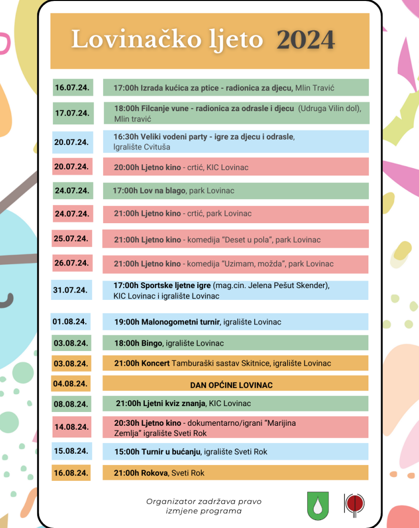 Home Kultura Lovinačko ljeto 2024 KulturaLovinacvijesti Lovinačko ljeto 2024 By Nikola Mraović - 10 srpnja, 2024 0 Facebook Ovogodišnji program “Lovinačkog ljeta 2024” uistinu je bogat sadržajima za sve uzraste. Općina Lovinac i KIC Lovinac pozivaju vas da svoje ljetne dane i večeri obogatite zabavom u ugodnom društvu i ambijentu lovinačkog kraja. Gs Press RELATED ARTICLESMORE FROM AUTHOR Odgovor saborskog zastupnika Zvonimira Troskota gradonačelniku Gospića Darku Milinoviću Otkrivene lokacije na kojima se ove godine vozi svjetski spektakl WRC Croatia Rally Demantij Milinovića: „Gospodine Troskot pločice u ramenu je lako mijenjati, ali opasne su one u glavi“