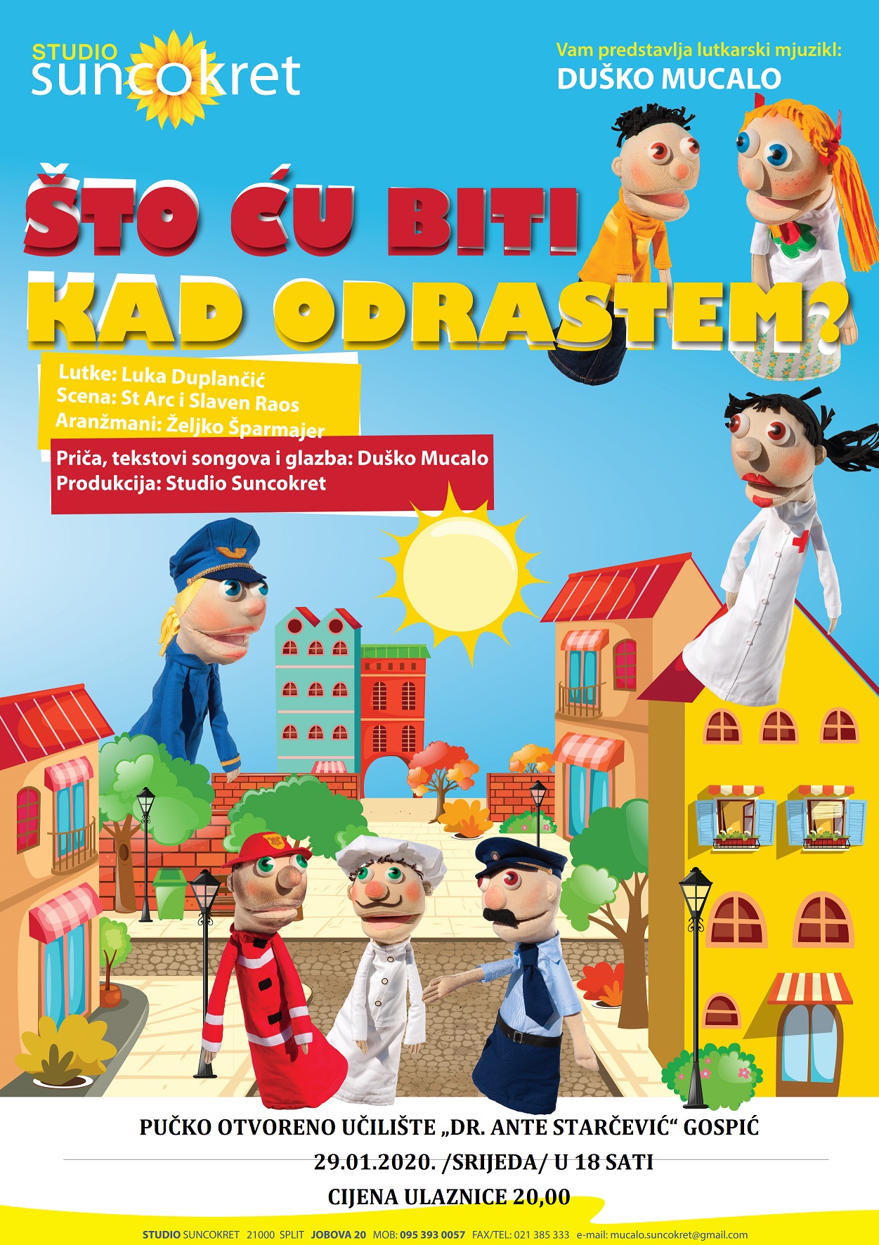 U svojoj ulici susreću ljude različitih zanimanja: policajca, liječnicu, kuhara, glumicu, vatrogasca, pilota, mornara, odgojiteljicu i učiteljicu te svima postavljaju isto pitanje: što im oni predlažu da postanu kad odrastu. Svi im redom odgovaraju da je upravo njihovo zanimanje najbolje. Uz to što se uz raspjevane songove i atraktivne lutke upoznaju s raznim zanimanjima, djeca na samom kraju lutkarskog mjuzikla dobivaju odgovor na pitanje: što ću biti kad odrastem?