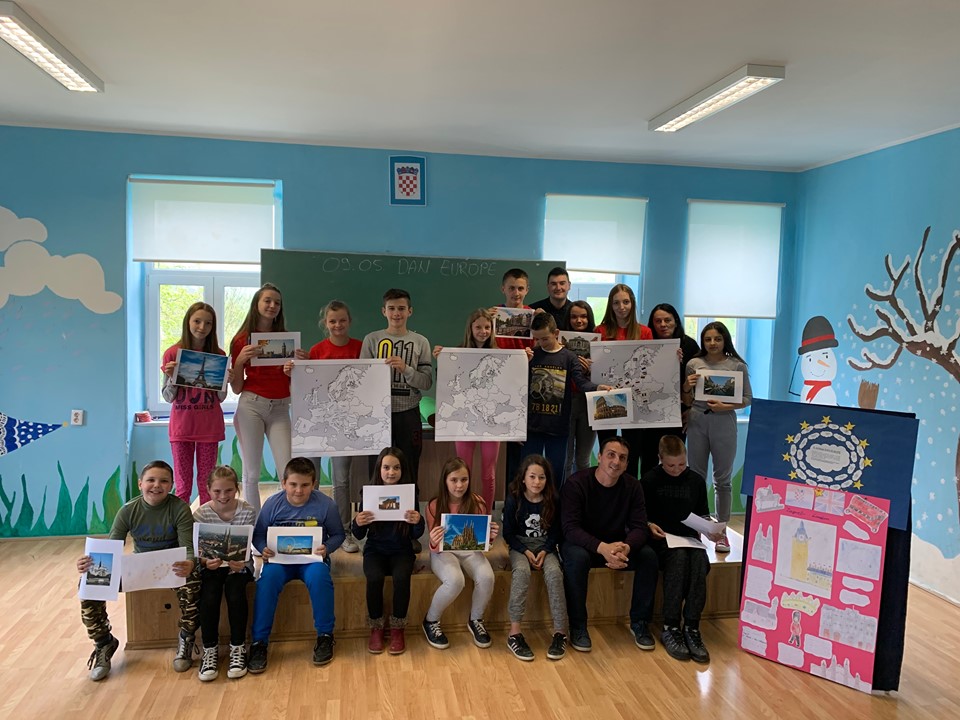 -Željeli smo naše učenike upoznati sa simbolima EU – himnom, zastavom, novcem te motom.Naši učitelji osmislili su nekoliko radionica za učenike na kojima su oni aktivno sudjelovali te prezentirali što su tijekom